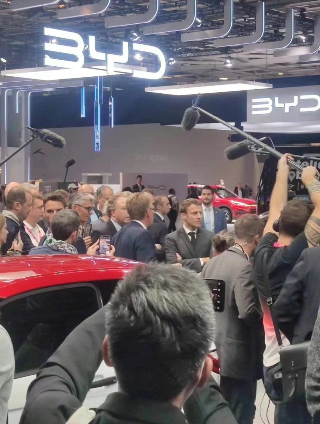 图为法国总统马克龙参观比亚迪展台