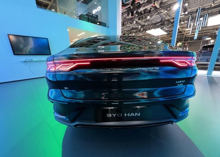 至于其它方面,差距并不大,此次在海外亮相的比亚迪汉,对应国内的比亚迪汉EV创世版,整体外观延续了国内版车型的设计语言,主要针对细节进行了调整,像车头不再使用“汉”LOGO,而是变成了“BYD”的统一标识。同时车辆尾部,汉的中文名称也变成了拼音字母“HAN”。