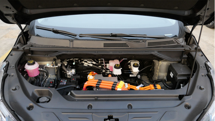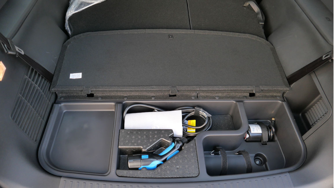 掀起盖板,下方还有多个小型储物格,除了充电枪、车载灭火器等必备物品,还能放下不少行车工具。