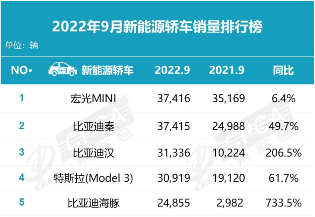 这不,今年9月份它就又以37416辆的销量成绩成为了“2022年9月新能源轿车销量排行榜”的榜一大哥。