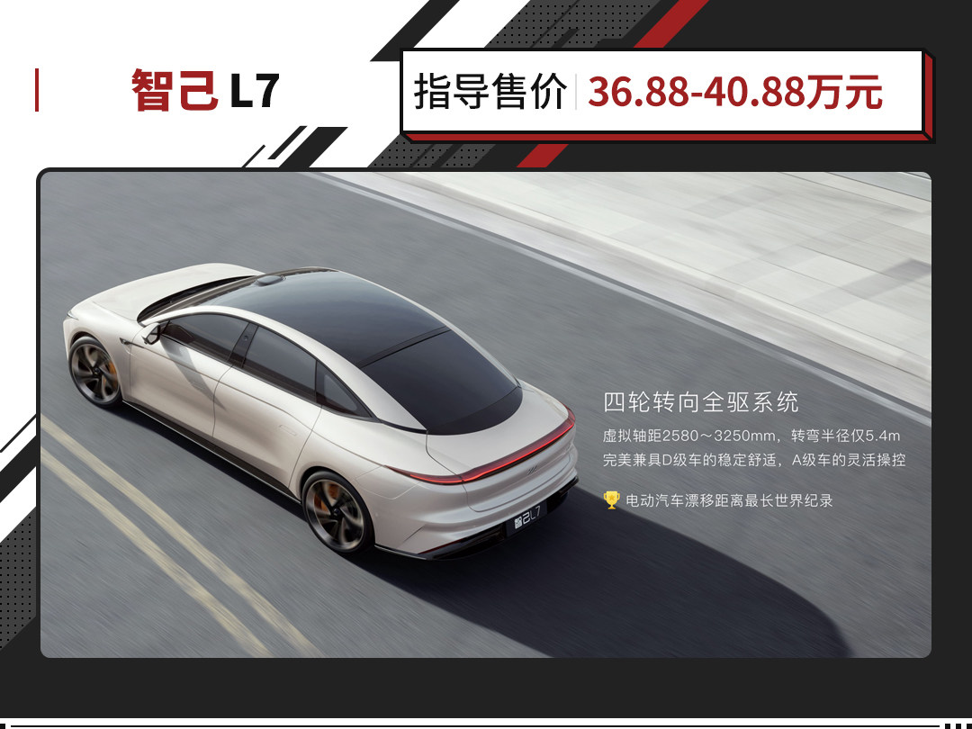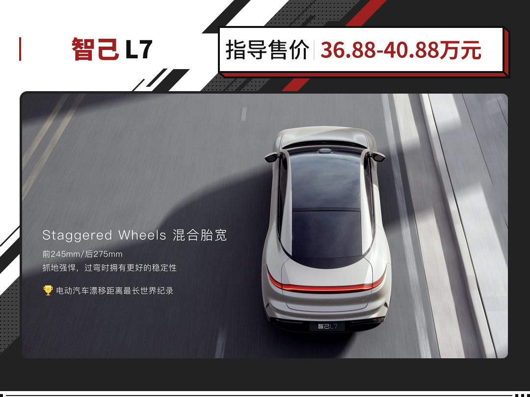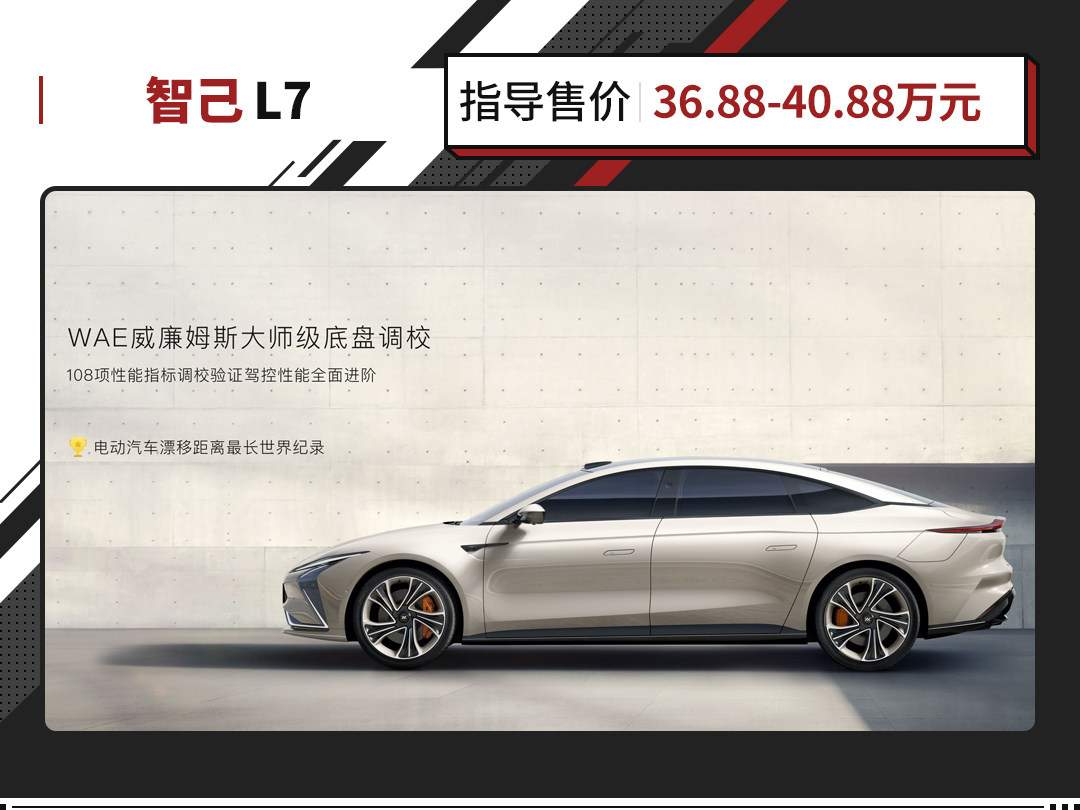 再者是驾控表现,智己L7搭载前后双电机系统,综合功率达到了425kW,峰值扭矩为725N·m,性能数据抢眼;且实测0-100km/h加速仅为3.87s,100km/h-0的制动距离只有32.69m,相当给力。电池组容量为93kWh, CLTC综合工况续航里程为615km。不仅如此,智己L7还配备了采埃孚四轮转向系统,其后轮系统可以实现双向共12度的转向,使得整车最小转弯半径仅为5.4m。另外,智己L7底盘前悬架为双球节式双叉臂前悬架,后悬架为全外球头式五连杆后悬架,并配备了CDC连续阻尼控制系统,提供舒适、日常、运动三种阻尼模式;且底盘调校由威廉姆斯前瞻工程团队参与,此前还一举打破了由保时捷保持的“电动车最长漂移距离”的世界纪录,可见驾控功夫了得。