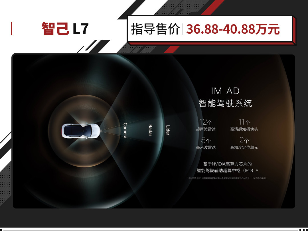 智能驾驶方面,智己L7可以用12+11+5+2来概括,即配备12个超声波雷达、11个高清摄像头、5个毫米波雷达、2个定位单元,且匹配英伟达Xavier (30-60 TOPS)芯片,后续还可以升级2个远距高精度激光雷达和更高算力的英伟达Orin芯片。软件方面则采用IM AD可进化驾驶辅助系统,基础包包括前向碰撞预警、限速报警、自动紧急制动、全速域自适应巡航、盲点监测、循线行驶、变道预警、自动避让、开门预警、指令式换道、侧后方预警、车道偏离预警等16项功能。高阶包还有高速高架领航辅助、高精度自动泊车等,需要后期通过OTA升级逐步开放。不过,这些功能在当下已经算是第一梯队的水平了。