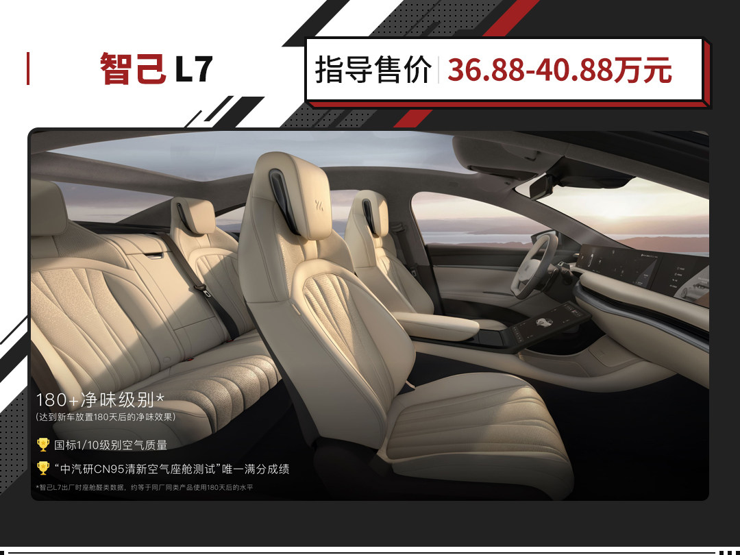 但除以上之外,智己L7还有一个杀手锏,那就是净味座舱。因为根据J.D.Power近三年的统计数据,“车内有令人不愉快的气味”才是最让广大新能源车主头疼的。而智己L7的内饰材料中,半苯胺真皮来自德国巴伐利亚的天然牧场,并采用植物栲胶;实木饰板则来自意大利科莫湖的郁金香木,且采用Open Pore喷漆工艺,每道喷漆工艺后增加烘烤时间,最后的真木总成件还要再经历一次24小时的80度烘烤。同时,车内的发泡材料等则是在智己汽车临港基地进行7-10天的散味处理,再配合无死角水基清洗除醛工序,相当于新车使用半年以上的散味效果。在一系列的努力下,智己L7成为目前中汽研“CN95清新空气座舱认证”唯一满分成绩的车型。