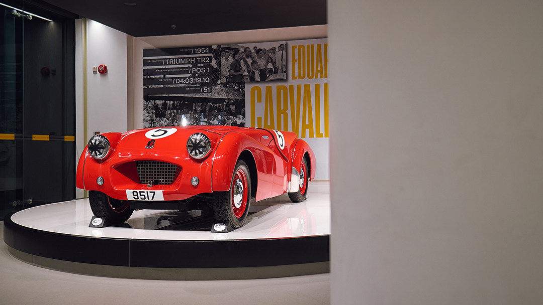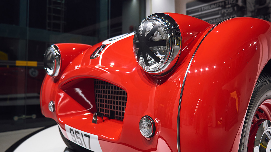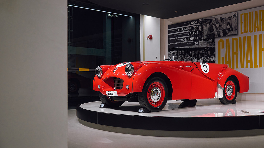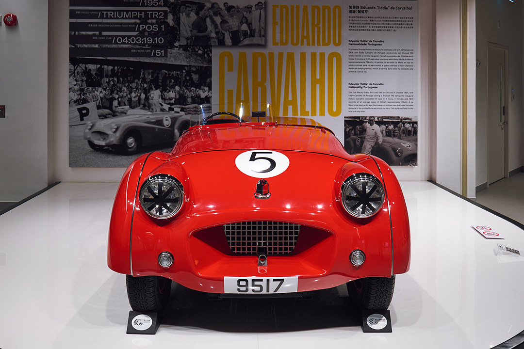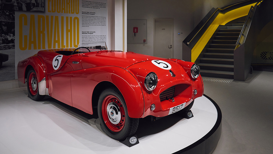 刷卡进入博物馆的首层,即可看到东望洋跑道的沙盘模型,以及博物馆的第一台展车——Triumph TR2。