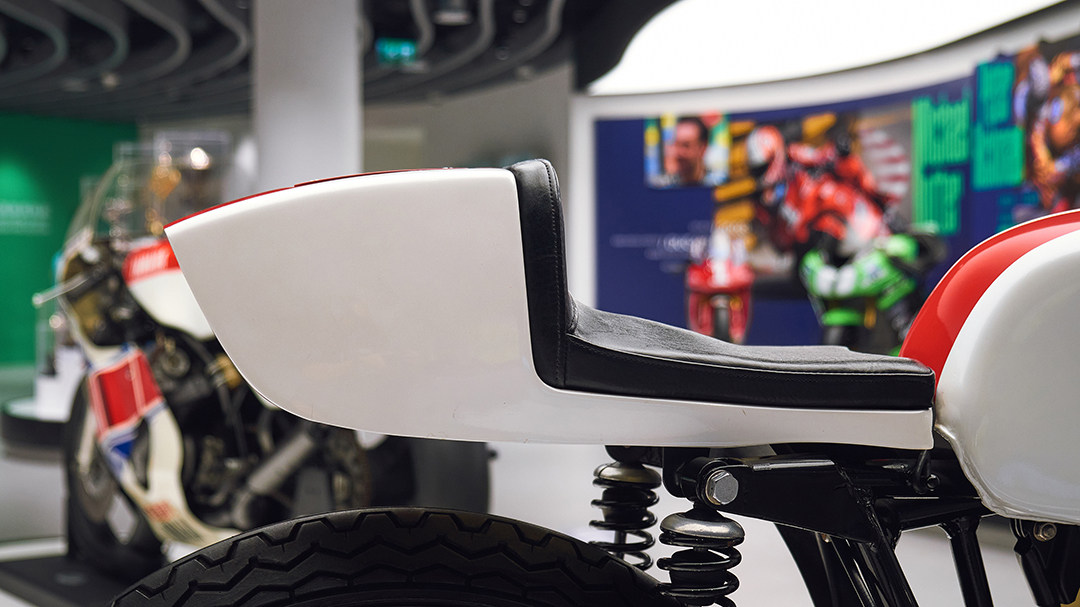 这就是夺得首届格兰披治电单车大赛冠军的雅马哈RD56,采用风冷并列双缸发动机。很难想象当年长谷川弘坐在如此单薄的小座垫上全力冲刺30圈夺冠到底是怎样一个场面~