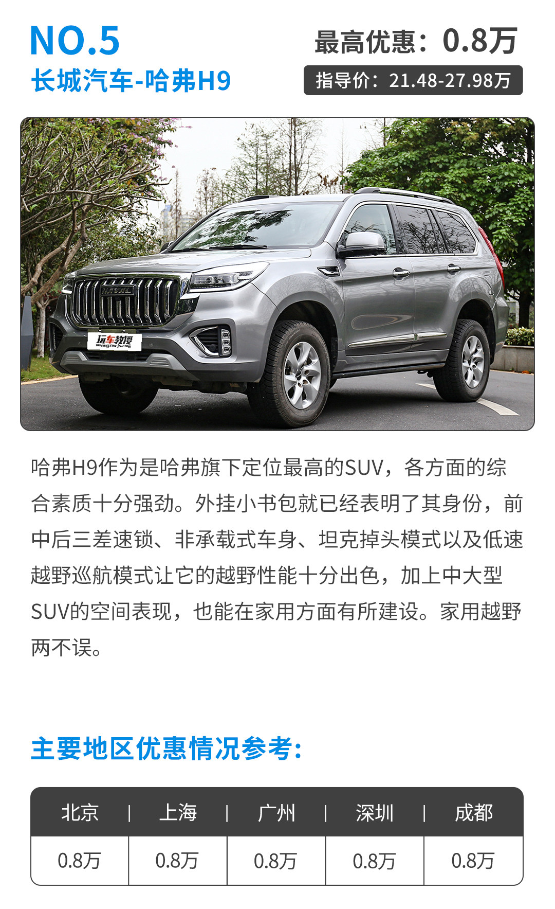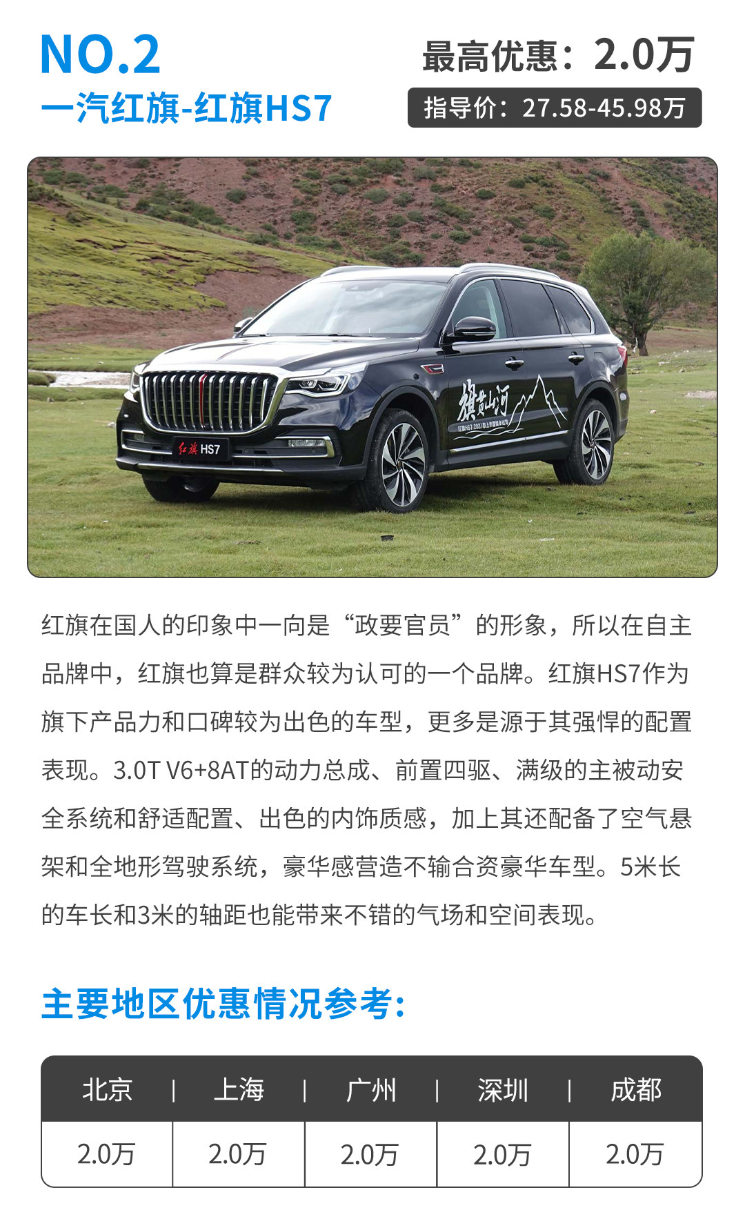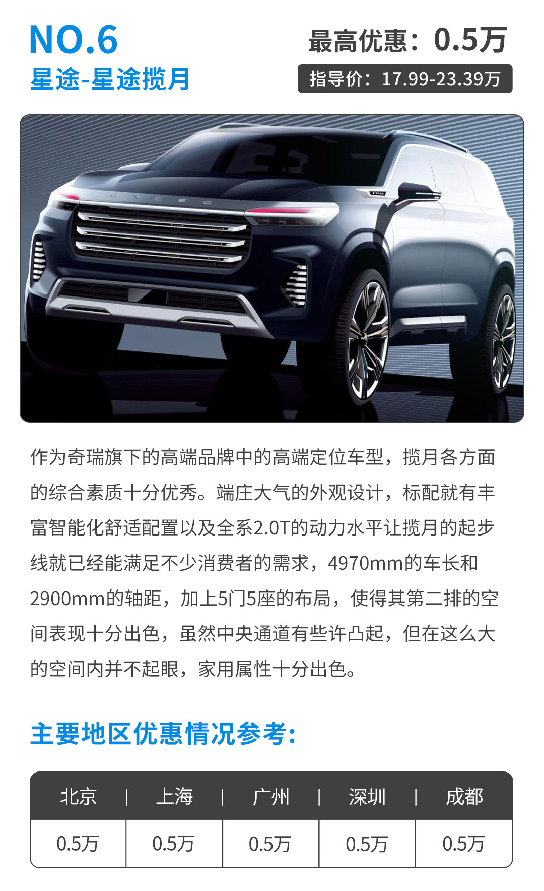 车型级别越高,自主品牌的性价就愈加明显,在中大型SUV这个定位中,拥有一台入门级SUV价格的车型也只有自主品牌能做到这一点了。如果屏幕前的你,想在有限且紧凑的预算中获得最大化的空间,那么不妨考虑下自主品牌旗下的中大型SUV吧。