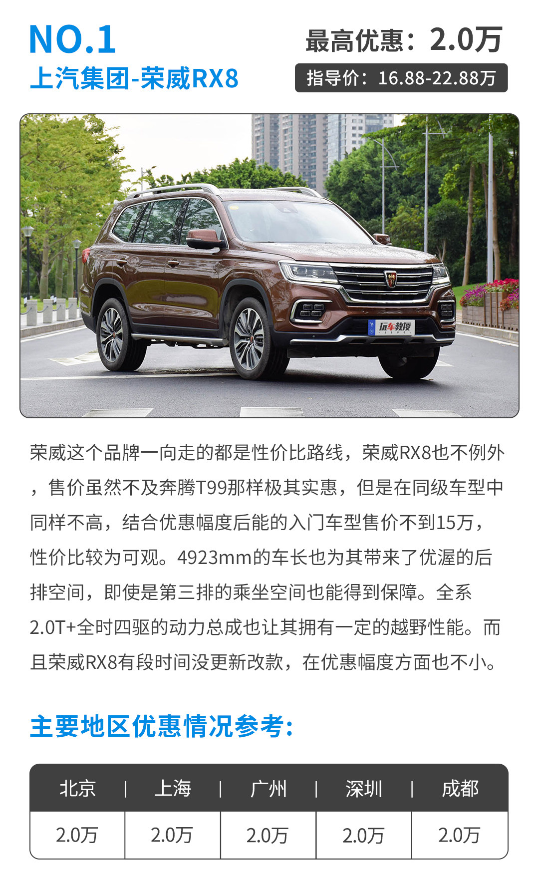 谈到中大型SUV,不少人肯定会觉得价格不菲,毕竟市面上的大多数的中大型SUV的售价普遍在30万往上。但也有许多良心厂家推出了不少的物美价廉的中大型SUV,只需要20万左右的价格就能拿下。