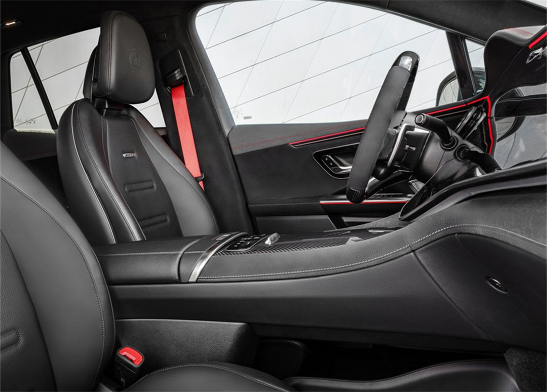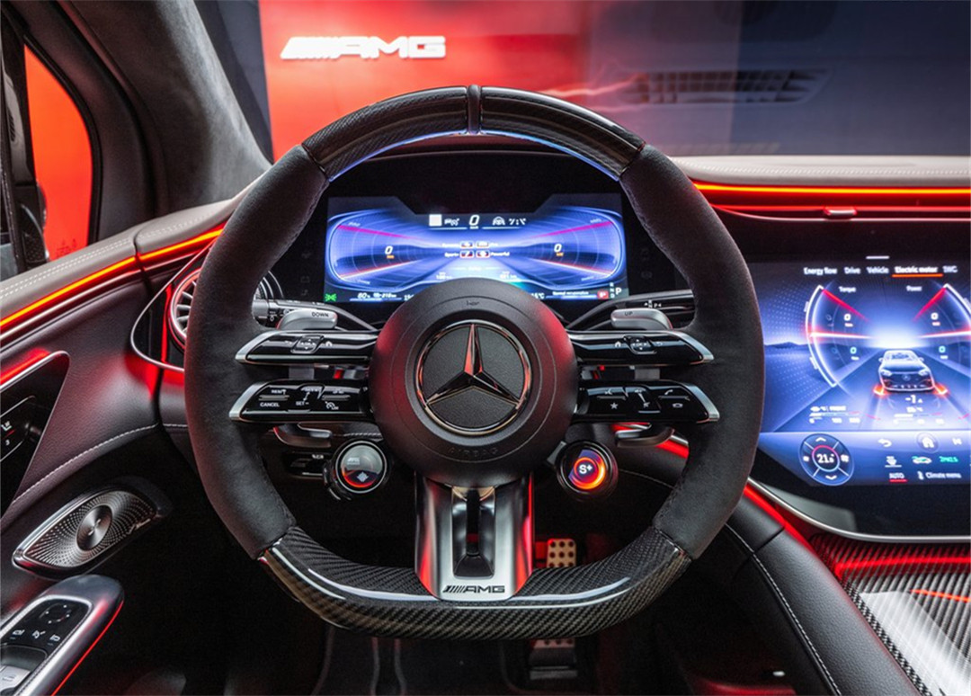 AMG版本的内饰同样是标准操作,换装了3、9点更窄的碳纤维平底方向盘,以及运动座椅。木饰板由大面积的碳纤维取代,车机系统里也会有AMG专属的功能。
