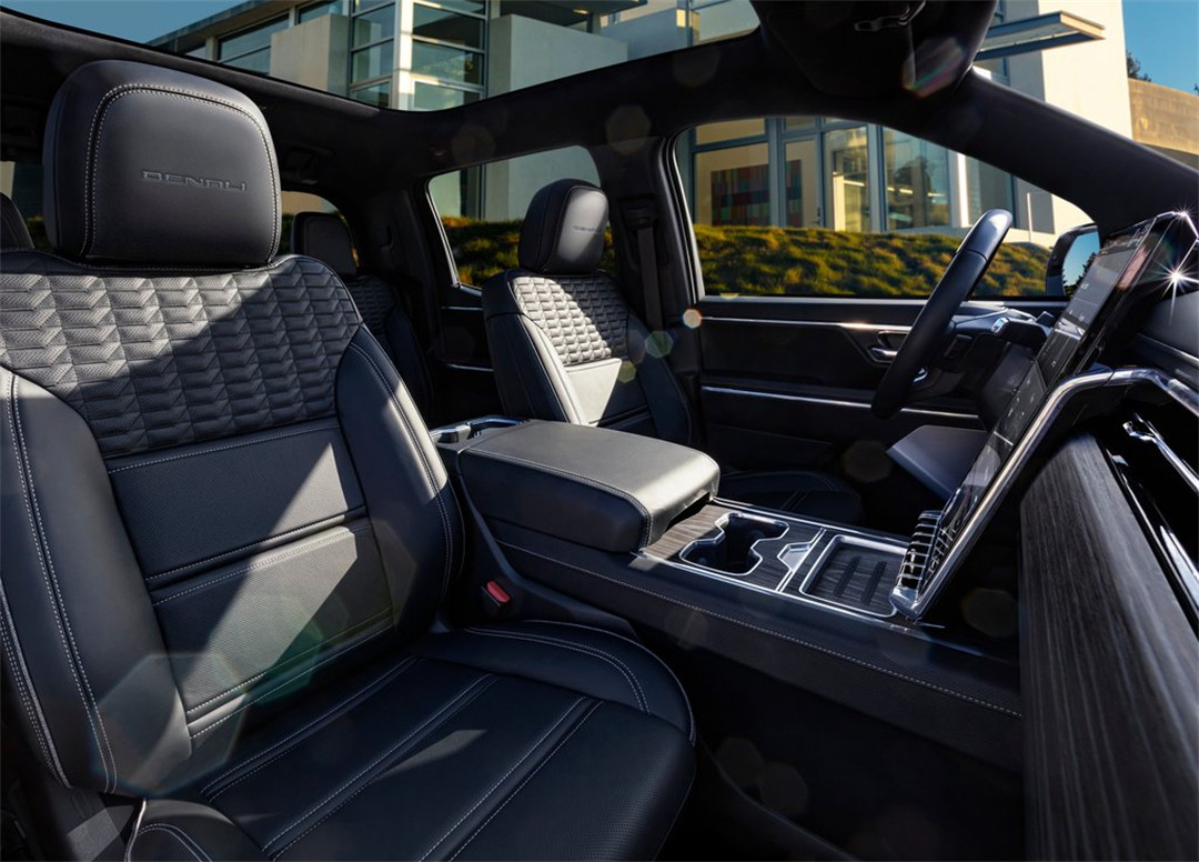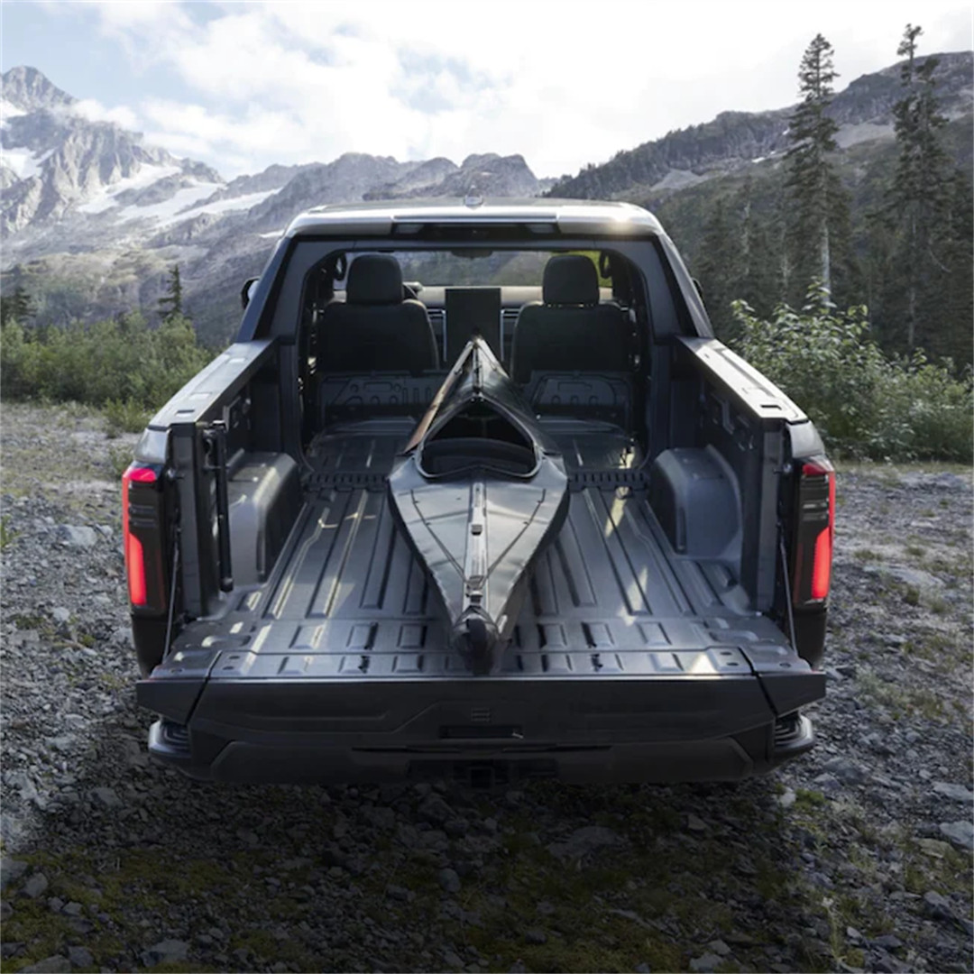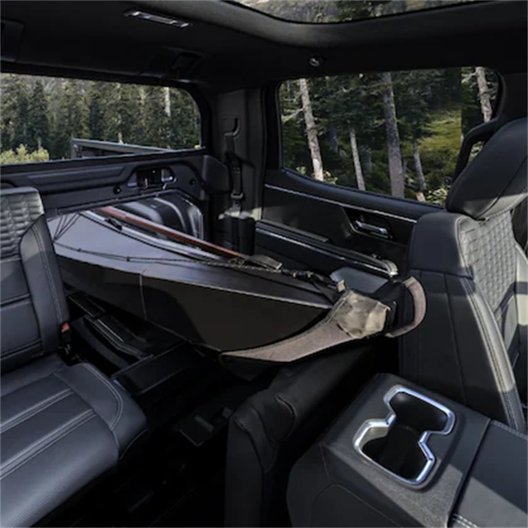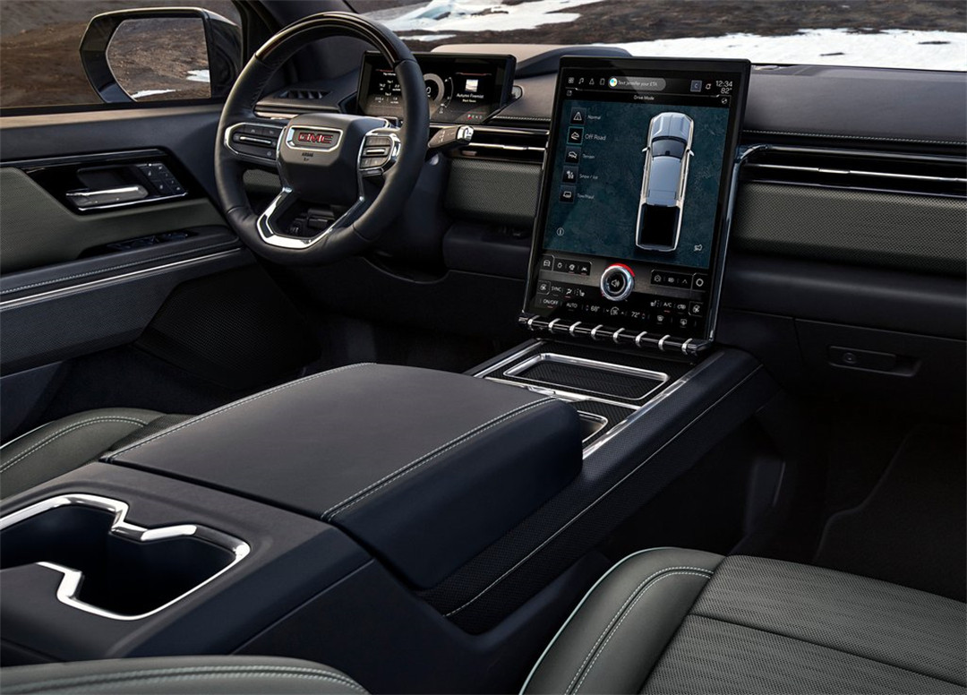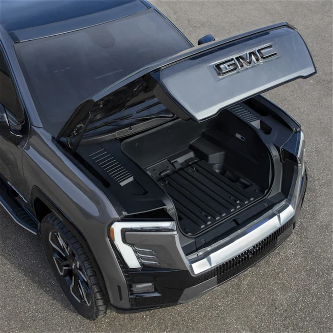 GMC标识同样能发光,让电动身份的辨识度相当高。前机盖上有复杂的线条勾勒力量感,里面腾出了空间不错的前备箱。其内置了一个120V的电源插座,而全车共有10个插座,提供高达10.2kW的外放电功能。