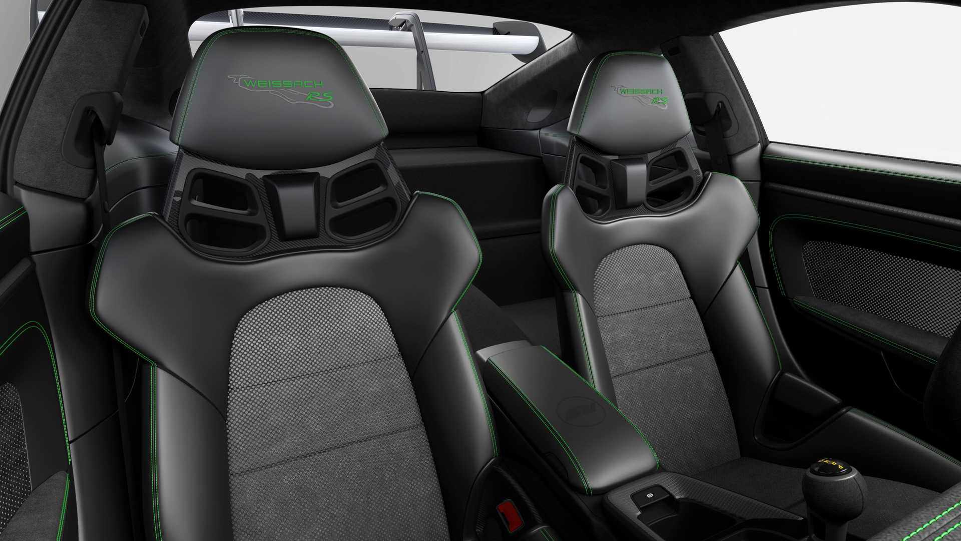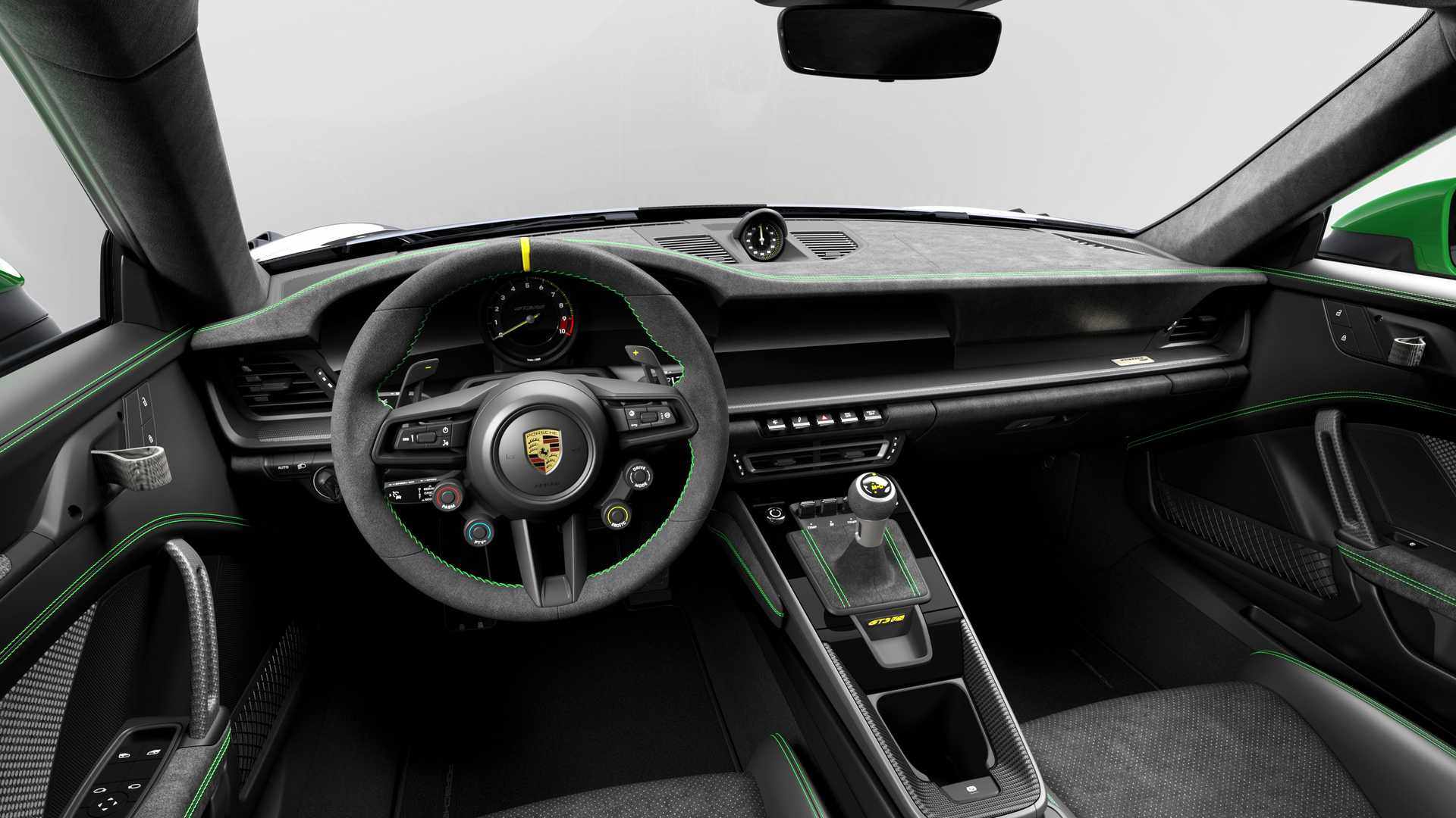 内饰方面,其主色调采用了黑色,这一点与车身外观颜色相反。同时,作为一台强调速度的超跑,保时捷911 GT3 RS Tribute to Carrera RS并未采用时下流行的红色作为内饰的点缀,相反,其在细节上采用了绿色作为点缀,包括在车门板、中控台、方向盘、座椅部分带有绿色缝线。