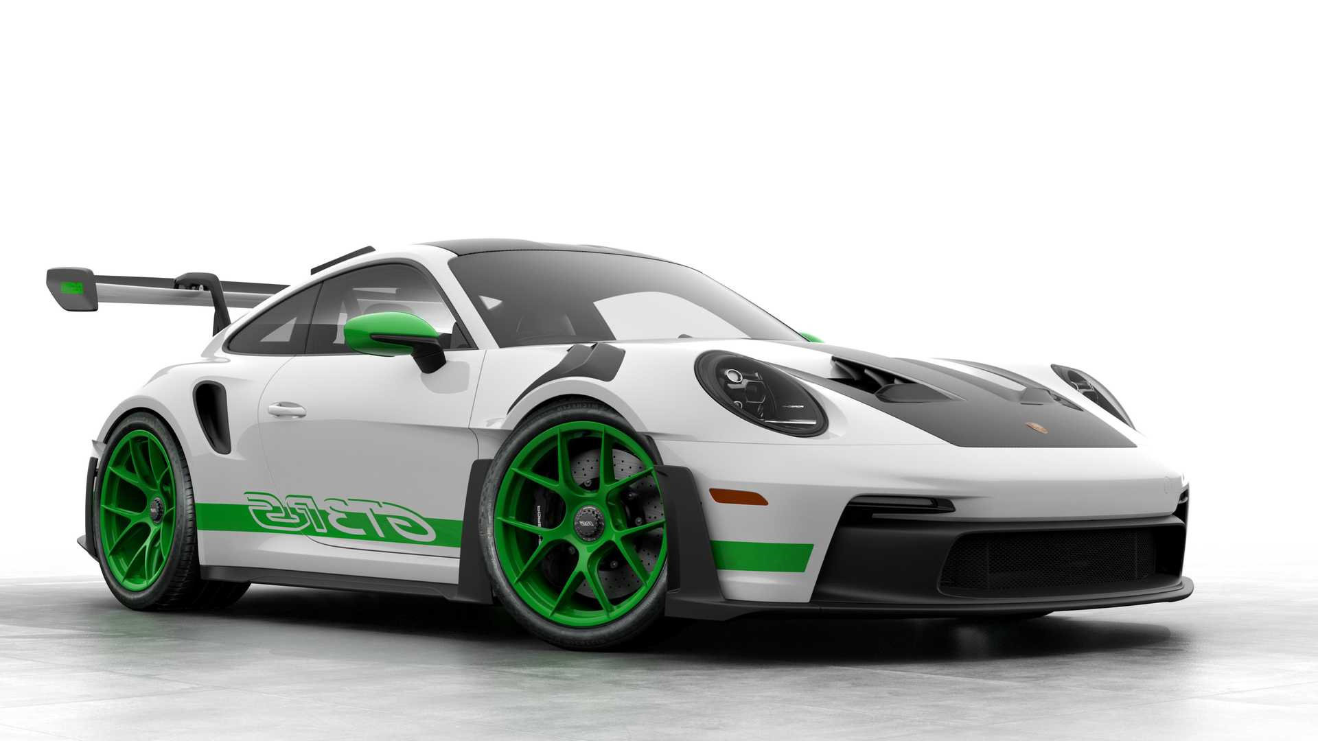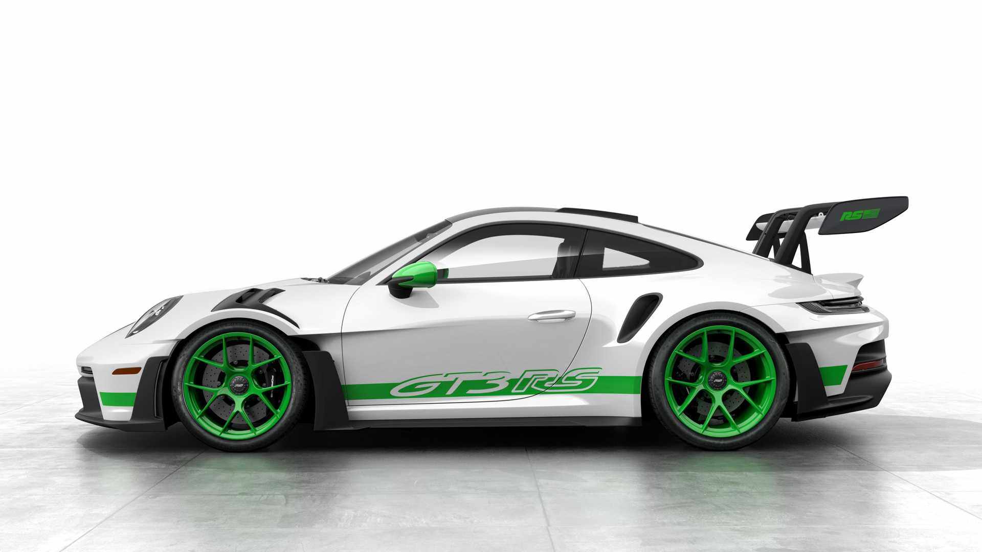 外观方面,新车与全新911 GT3 RS Weissach版基本相同,只是换上了全新的车身涂装,并且在细节方面做出了改进。新车采用了白色作为车身主色调,在前包围、外后视镜壳、车门下方、车尾、扰流板等位置则是采用了绿色的拉花涂装,这使得整车线条感被进一步勾勒出来,同时也增添了几分运动感。