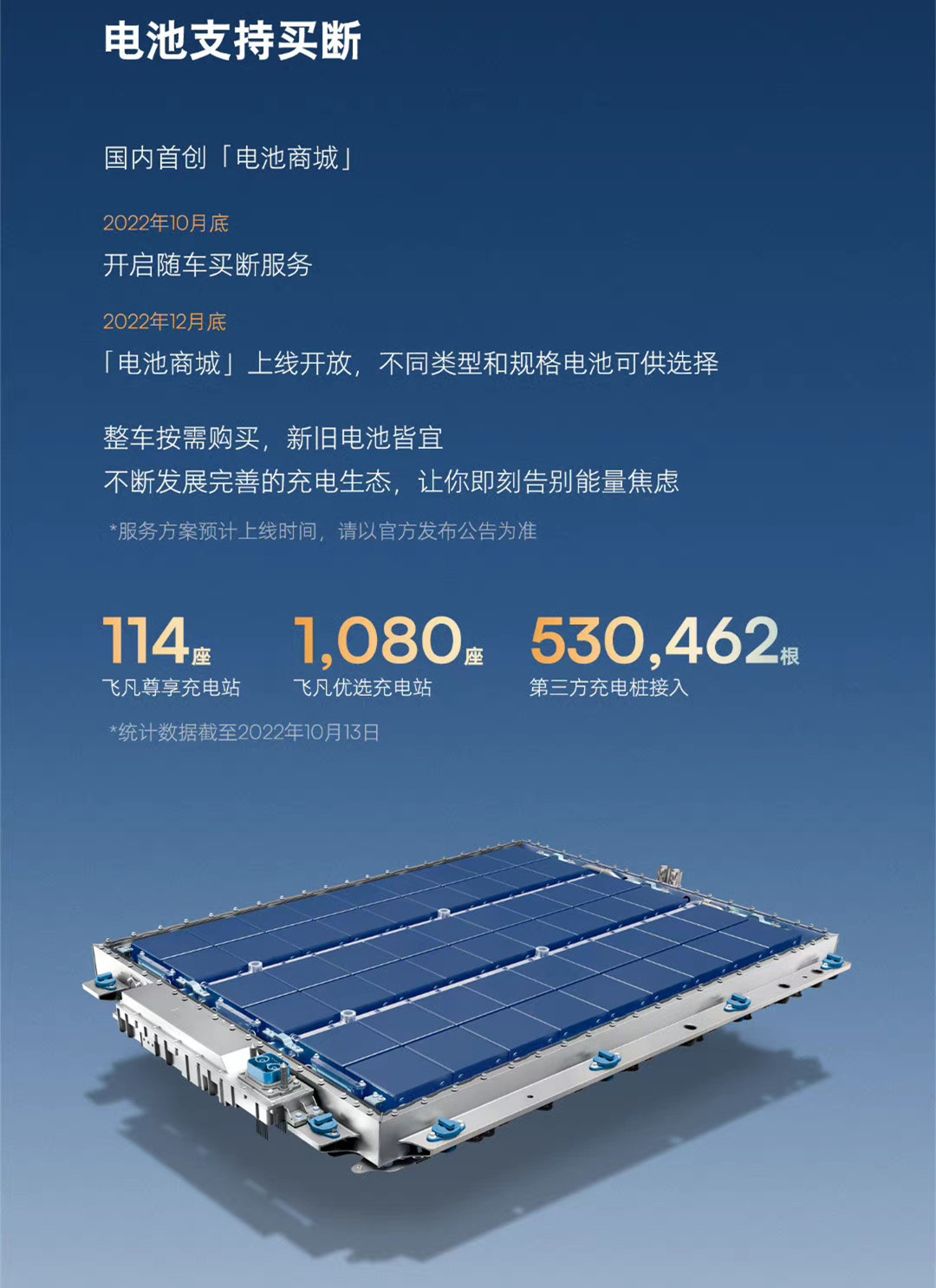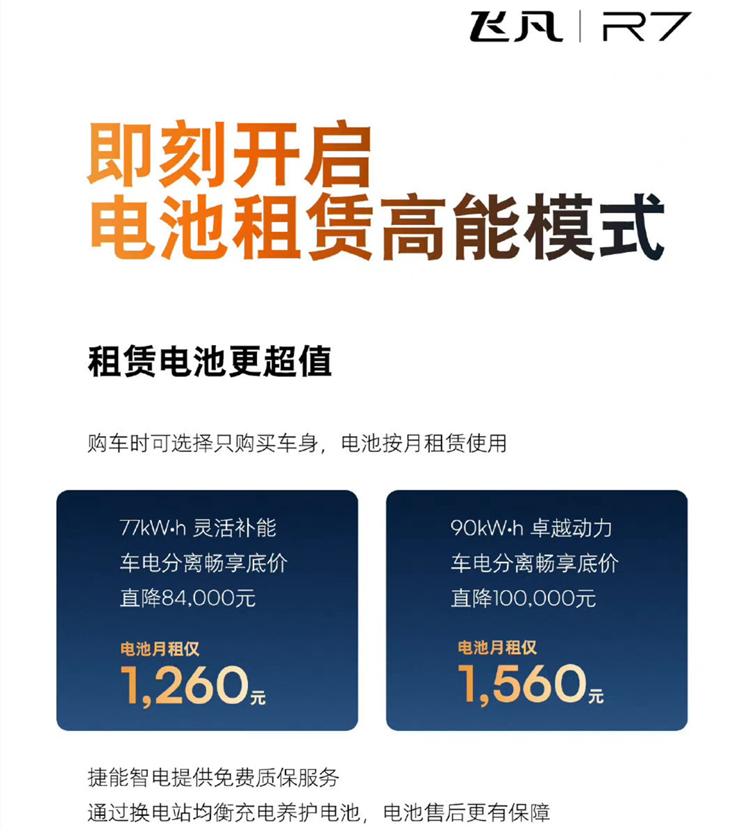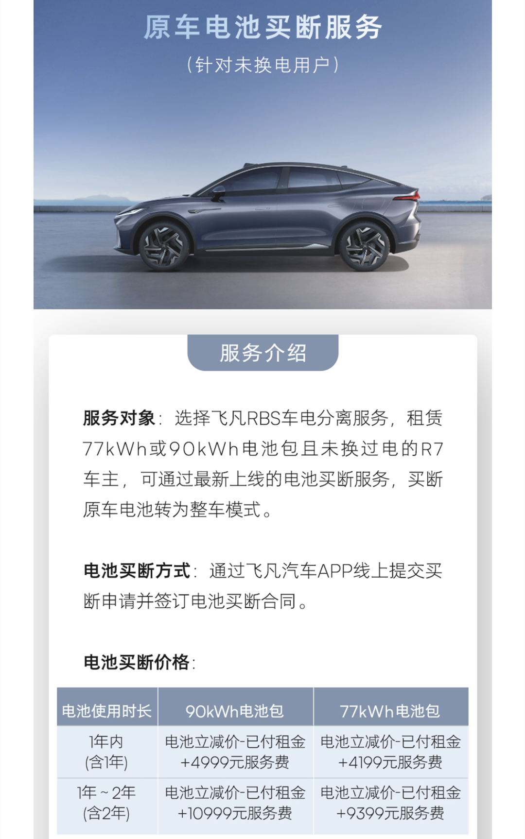 电池租赁提供了价格实惠、高自由度的购车用车途径,这也是蔚来大多数用户的选择。飞凡的车电分离服务:
