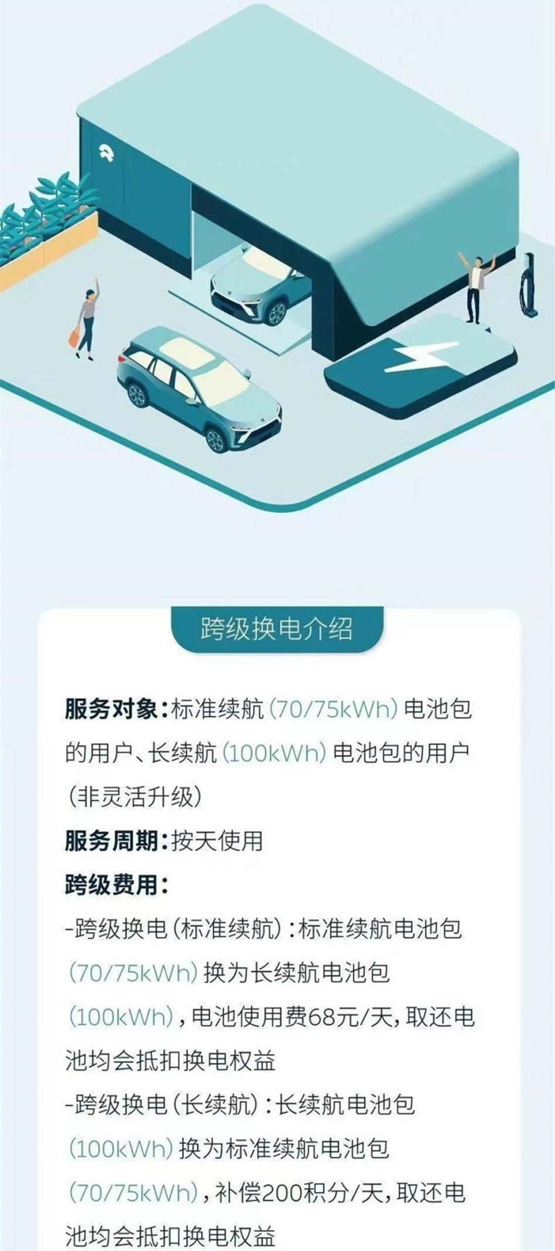 目前蔚来已经开展了日租模式的试点,小容量升大容量、大容量降小容量都可以。前者需要补68元/天,后者是按200积分每日来补偿,这可比过去只能花880元月租升级要灵活很多。