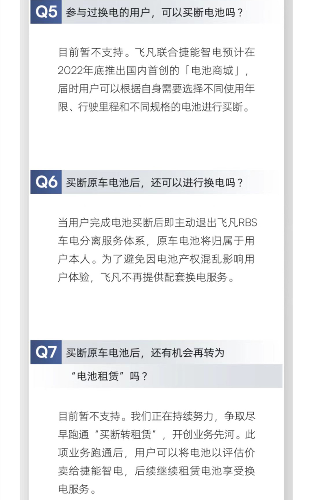 不同的是飞凡的这块电池是属于捷能智电所有,而蔚来的电池是自己的。这就导致了换电是电池租聘的专属服务,买断电池后就失去了换电资格,不像蔚来都可以换电。