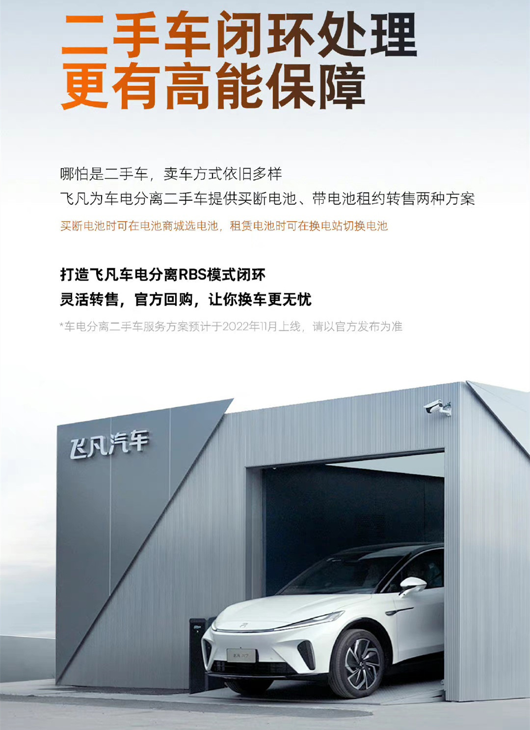 此外飞凡也提供了官方二手车交易平台,可以买断电池后整车转售,以及带电池租约转售。