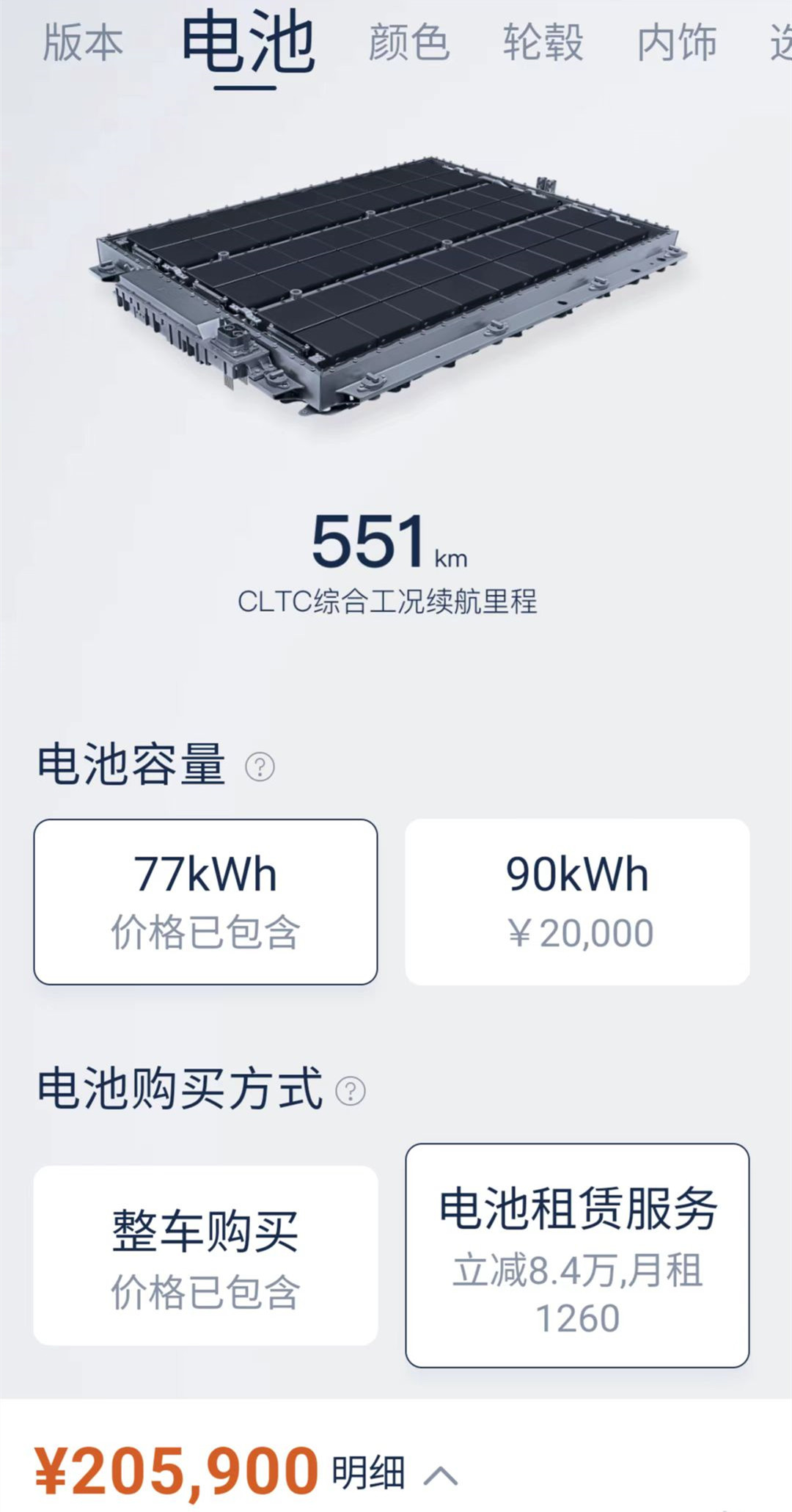 90kWh车价立减10万,租金1560元/月,比蔚来的1680元便宜。