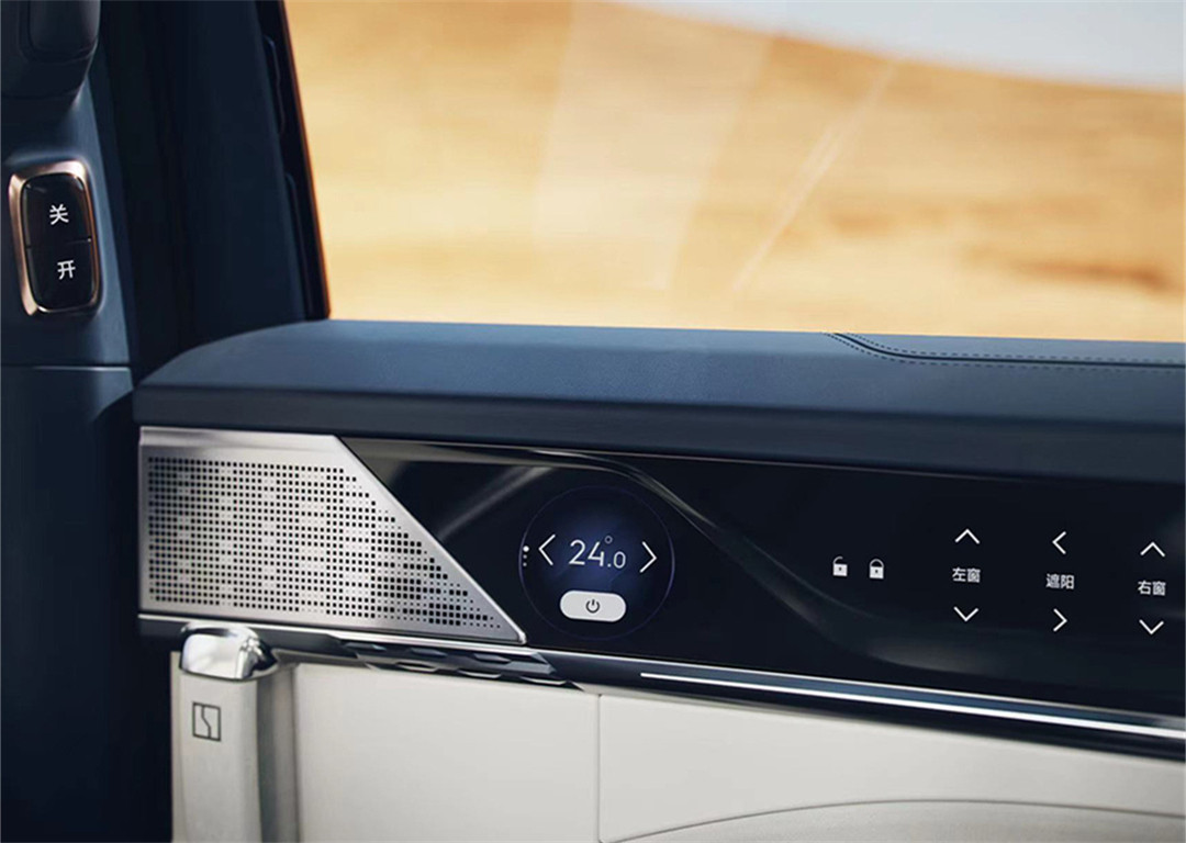 小桌板放收纳在了扶手里面,吸顶屏幕为15.6英寸,可以接入SWITCH游戏机、实现无线投屏等功能。侧滑门上有3.4英寸触控屏可以控制开关门,还能调节空调,当座椅调整前后位置时,出风口的风向也会同步跟随。