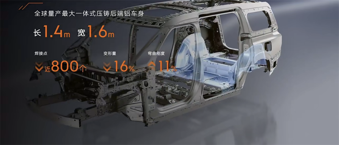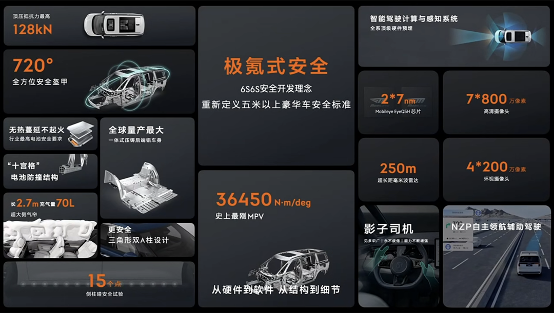 底盘方面,空气悬架和CCD电磁减振系统为全系标配。后车身采用特斯拉相同的一体式压铸工艺,减轻重量之余,还能提升安全性,让009的车身刚性是丰田埃尔法的两倍有多。