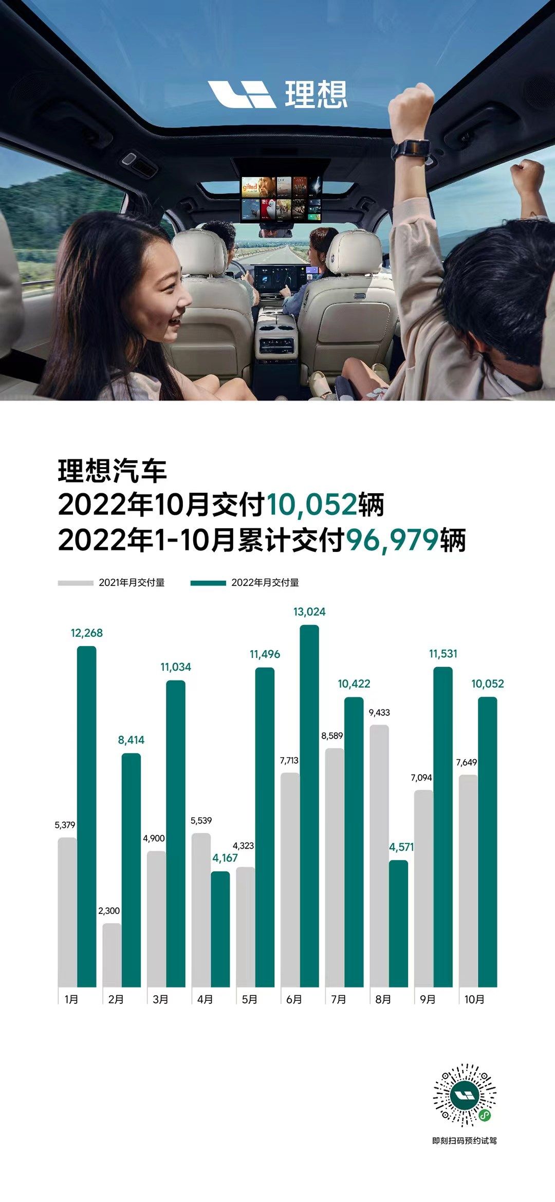 2022年11月1日,理想汽车公布2022年10月交付数据。2022年10月,理想汽车共交付新车10,052辆,同比增长31.4%。截止到2022年10月31日,理想汽车累计交付量为221,067辆。