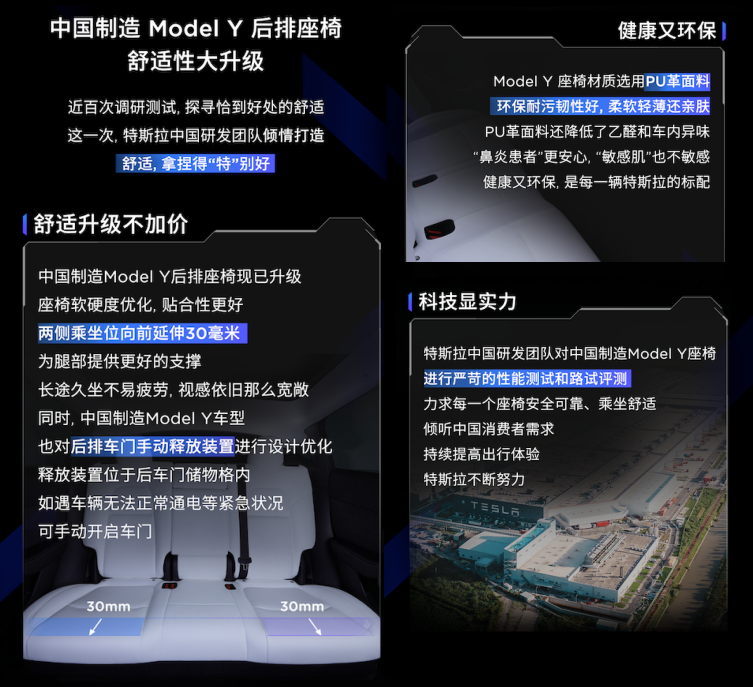 目前,特斯拉中国通过社交平台宣布,中国制造Model Y车型针对后排座椅舒适度,以及后车门应急开启方式进行优化升级,不仅后排座椅加长30mm,同时优化座椅软硬度,加大靠背软区面积,减缓乘坐过程中的疲劳感。