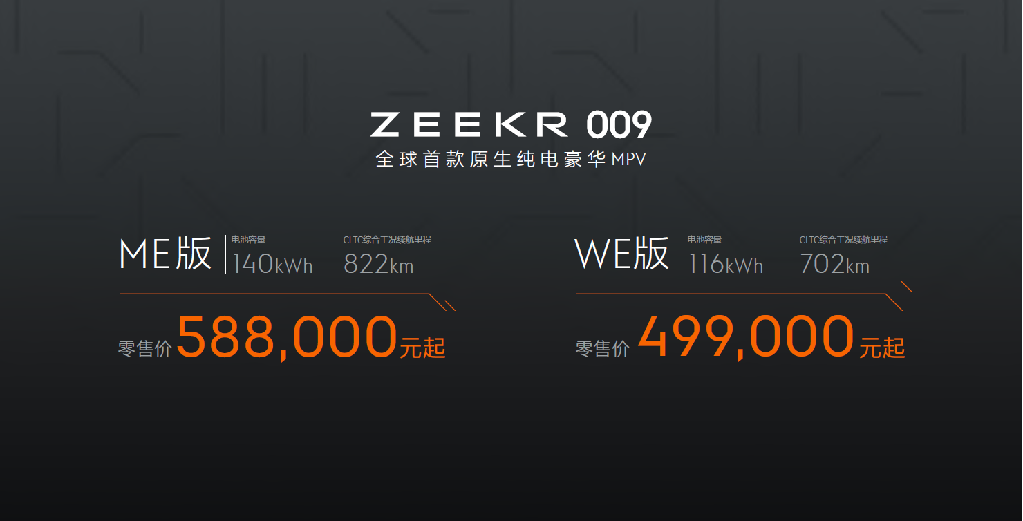11月1日,极氪发布了全球首款原生纯电豪华MPV极氪009,新车预计将于2023年1月份正式开启交付。极氪009一共分为了两款车型,其中WE版官方零售价为49.9万元,ME版官方零售价为58.8万元。