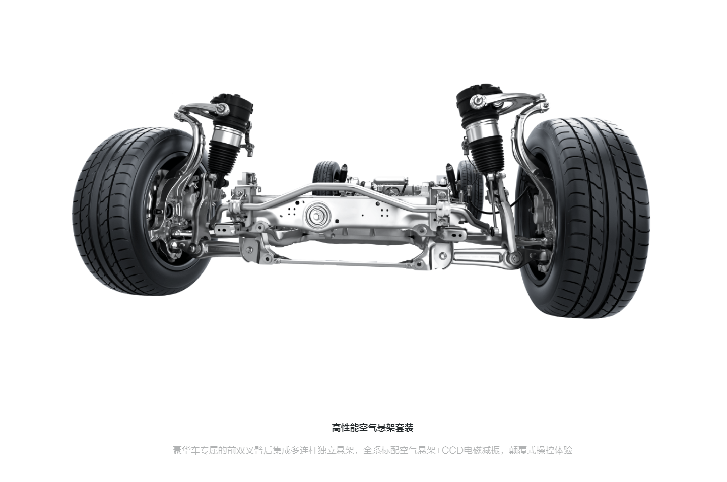 在底盘结构上,极氪009采用了前双叉臂/后悬架多连杆全铝四轮独立悬架。同时,极氪009全系标配了空气悬架系统+CCD电磁减振系统,可以根据乘员舱前后左右质量分布实现实时智能配平。