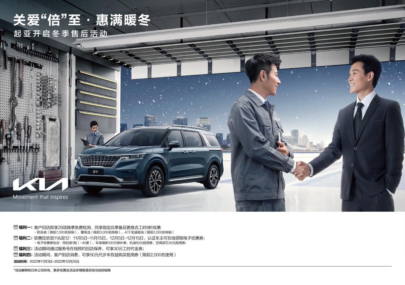 2022年11月3日,起亚宣布开启“关爱‘倍’至 · 惠满暖冬”冬季售后关爱活动。此次活动面向起亚全系车型,起亚将持续为用户提供备品折扣、代步车权益抵用券、超值电子优惠券、回店保养工时代金券等四重暖心礼遇,更好地满足用户冬季用车养车需求,保障用户安全出行。