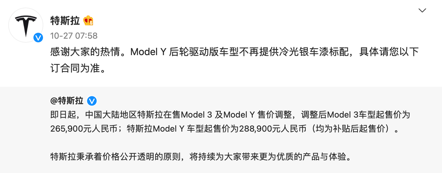 在特斯拉宣布降价后,很快官方便在微博说到,“感谢大家的热情。Model Y后轮驱动版车型不再提供冷光银车漆标配。”