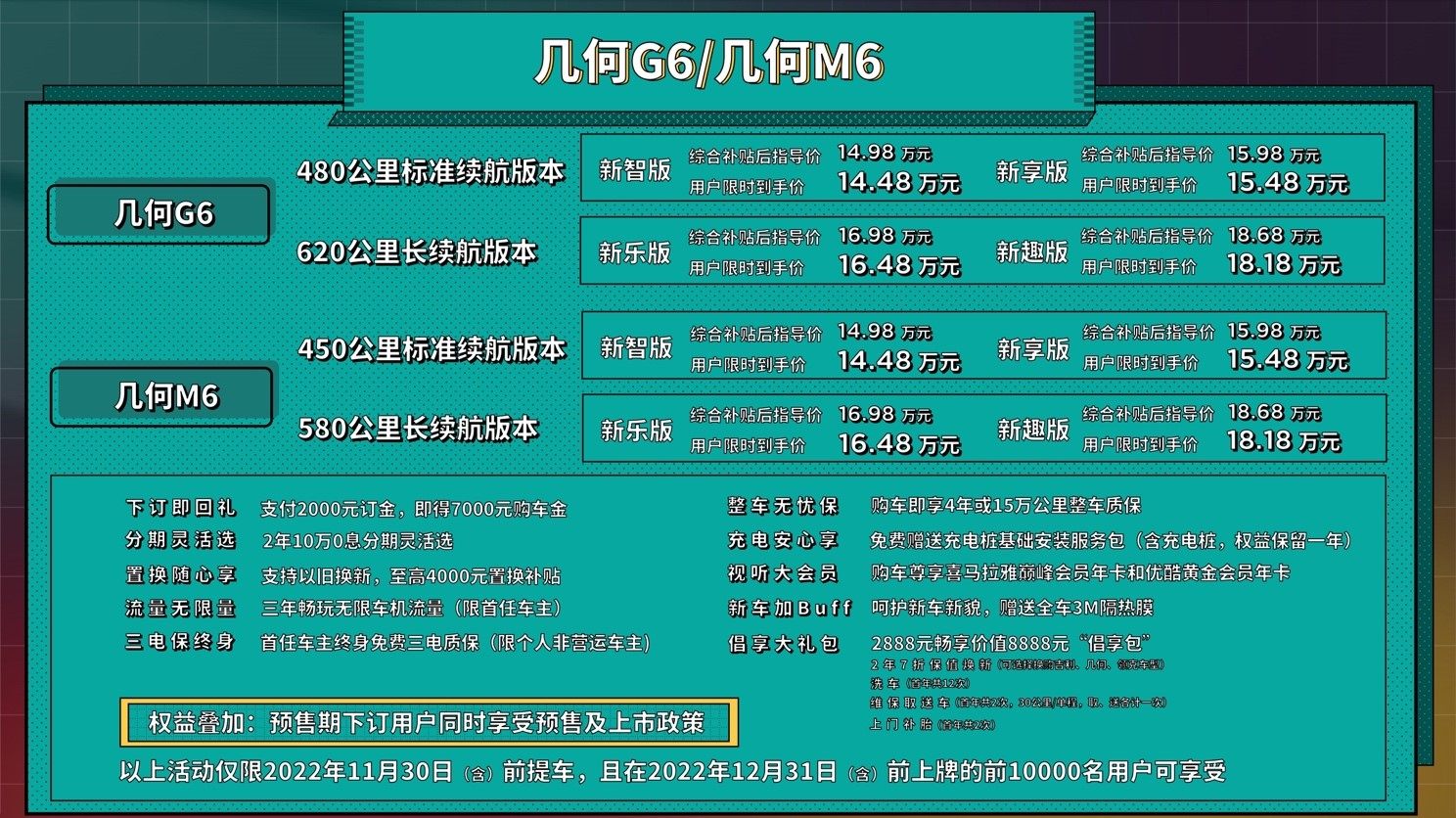 此外,几何汽车还为用户带来了多重“新智特权”,包含支付2000元订金即享7000元购车金的下订即回礼、2年10万0息分期灵活选、三年畅玩无限车机流量、终身免费三电质保,以及支付2888元即可畅享价值8888元好礼的倡享大礼包等,在预售期下订的用户也可以同时享受预售及上市双重政策。