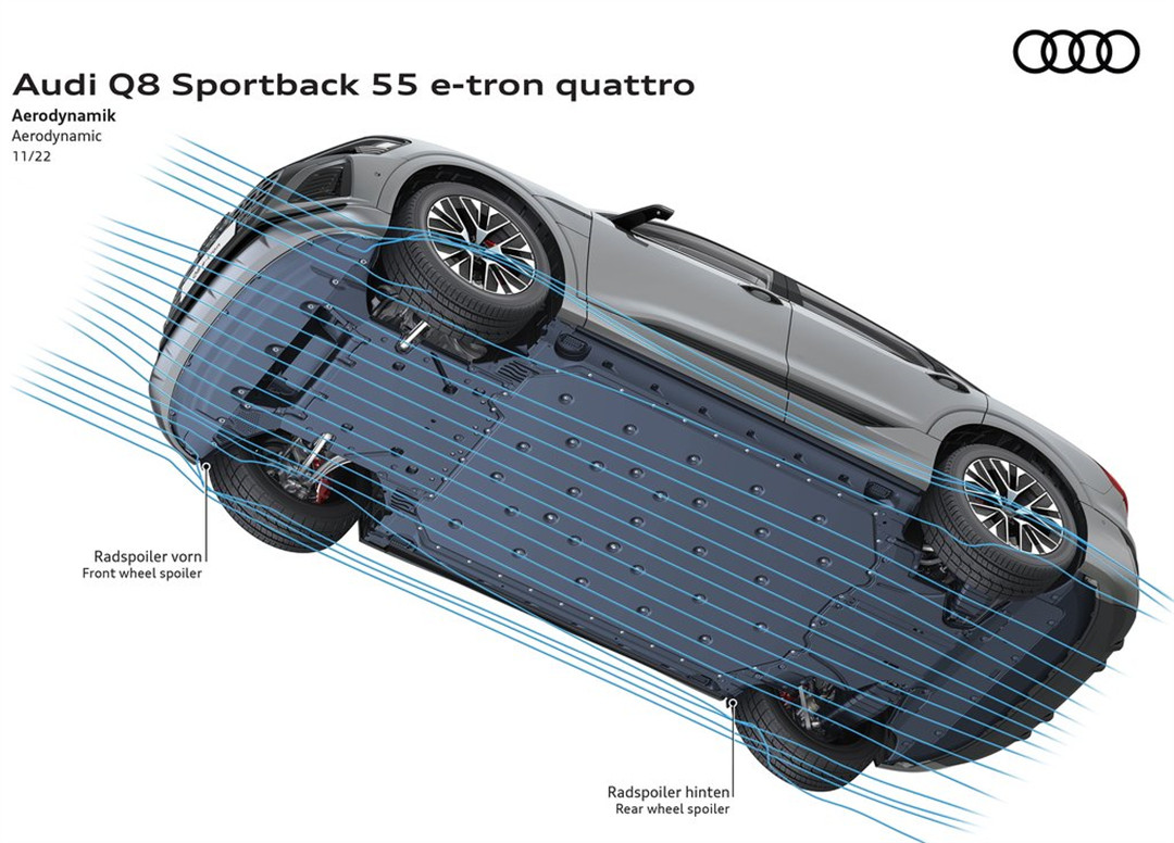 Q8 e-tron还对前后轮拱的扰流板进行了优化,让风阻系数从老款的0.28Cd下降到了0.27Cd,Sportback更是低至0.24Cd,对于一台SUV来说已经是顶流水平了,可见溜背车顶在这方面是很有贡献的。