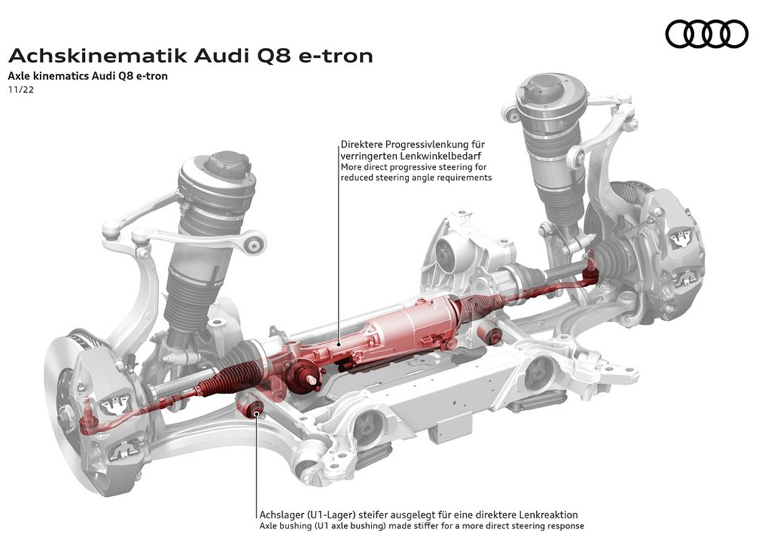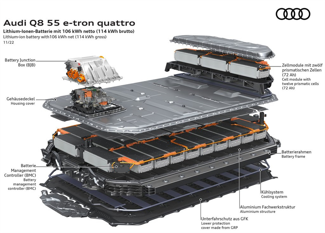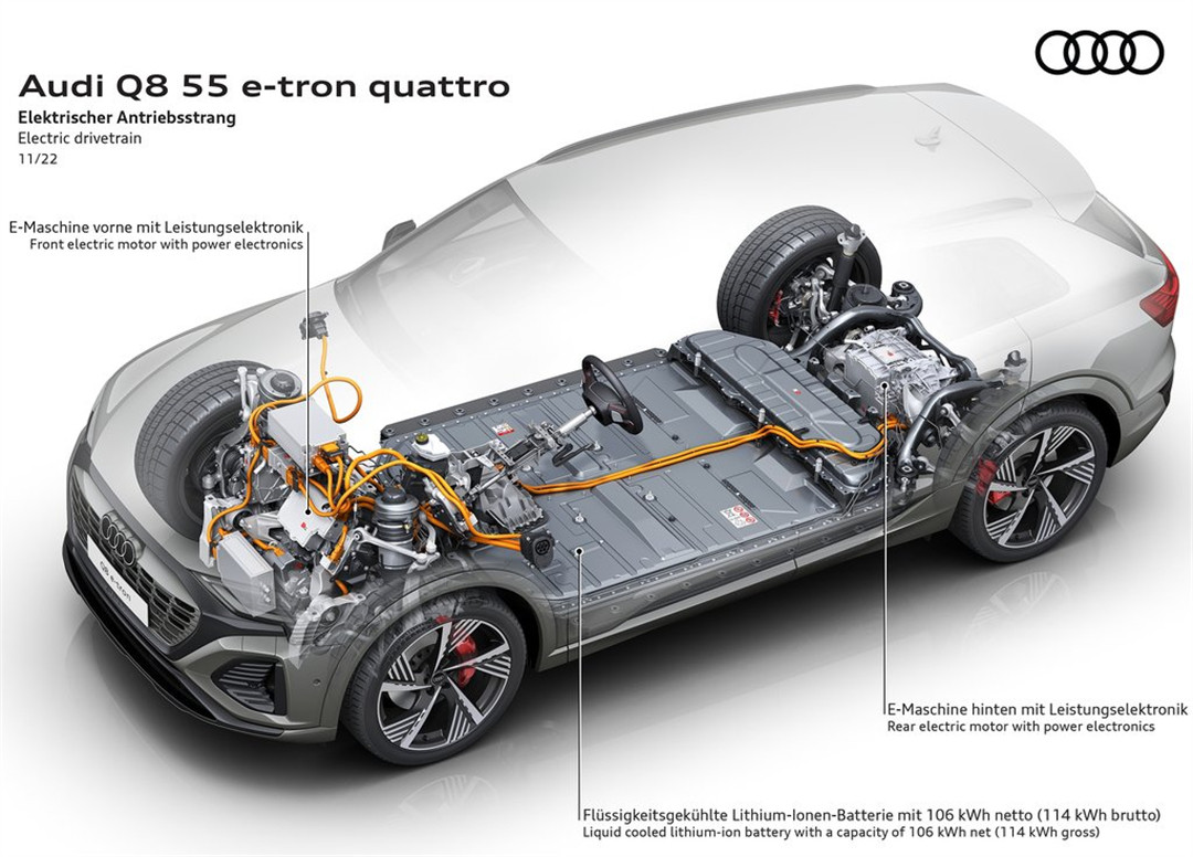 e-tron用的不是Q5 e-tron上的MEB纯电平台,而是基于MLB Evo这个纵置发动机平台打造,与Q7、卡宴相同,所以中期改款的Q8 e-tron自然也是如此。