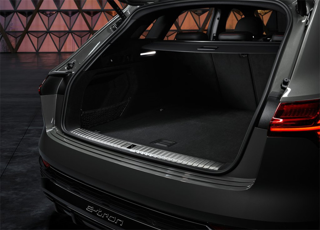 Q8 e-tron的尾箱空间为569L,前机盖还有一个62 L的前备箱,而Sportback的尾箱空间由于造型的原因缩小到了528L。