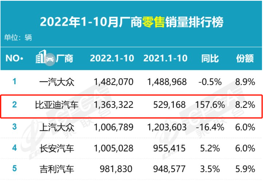 乘联会数据显示,比亚迪在今年1-10月份的累计销量达到了1363322辆,相较于去年同期销售的529168辆,涨幅高达157.6%,在中国汽车市场上的销量表现仅次于一汽大众。