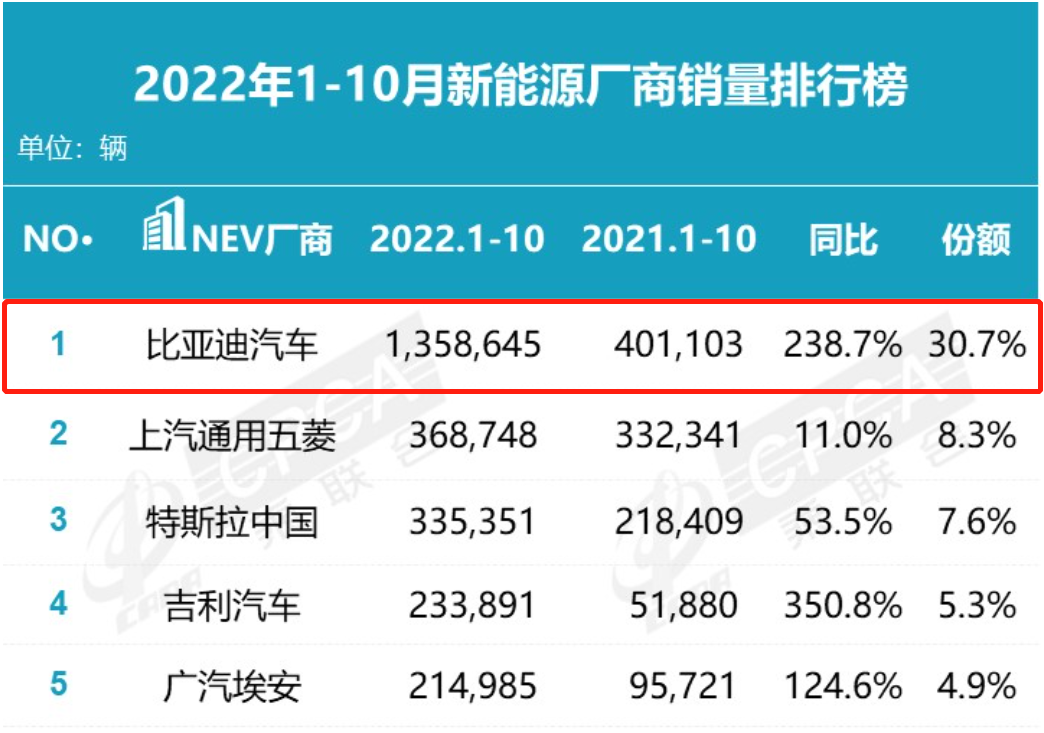 然而,比亚迪在新能源汽车市场的销量表现却堪称一骑绝尘。它在今年1-10月份的新能源汽车销量高达1358645辆,相较于去年同期销售的401103辆,上涨了高达238.7%。比亚迪今年前10个月的销量比位居第二的上汽通用五菱多了近100万辆。