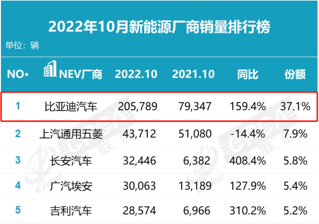 比亚迪在10月份新能源汽车销量达到了205789辆,相较于去年同期销售的79347辆,涨幅达到了159.4%。另外,比亚迪占据了10月份国内新能源汽车市场37.1%的市场份额。这也就意味着,中国市场在10月份每卖出100辆新能源汽车,就有37辆是比亚迪。