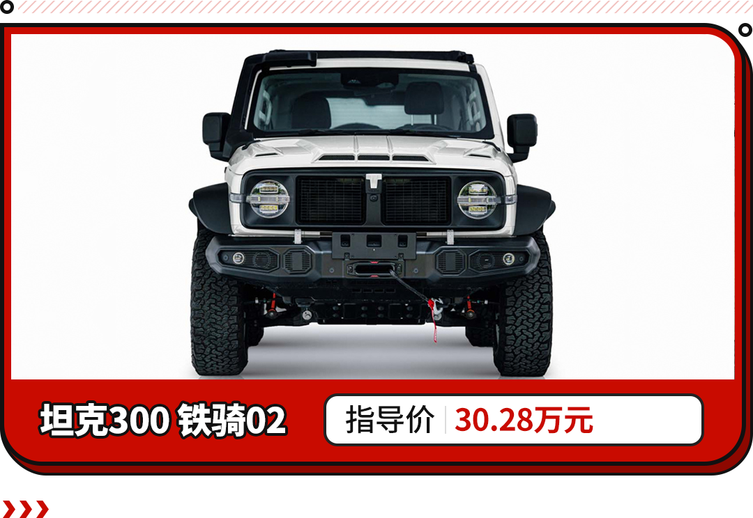 近日,从官方了解到,坦克300 铁骑02在官方APP上正式开售,本轮发售白色铁骑02仅1000台,新车的指导售价为30.28万元。新车作为特别版车型,在外观、底盘方面做出了较大的优化,使得它的户外气息更为浓厚,越野性能也更加的强悍。