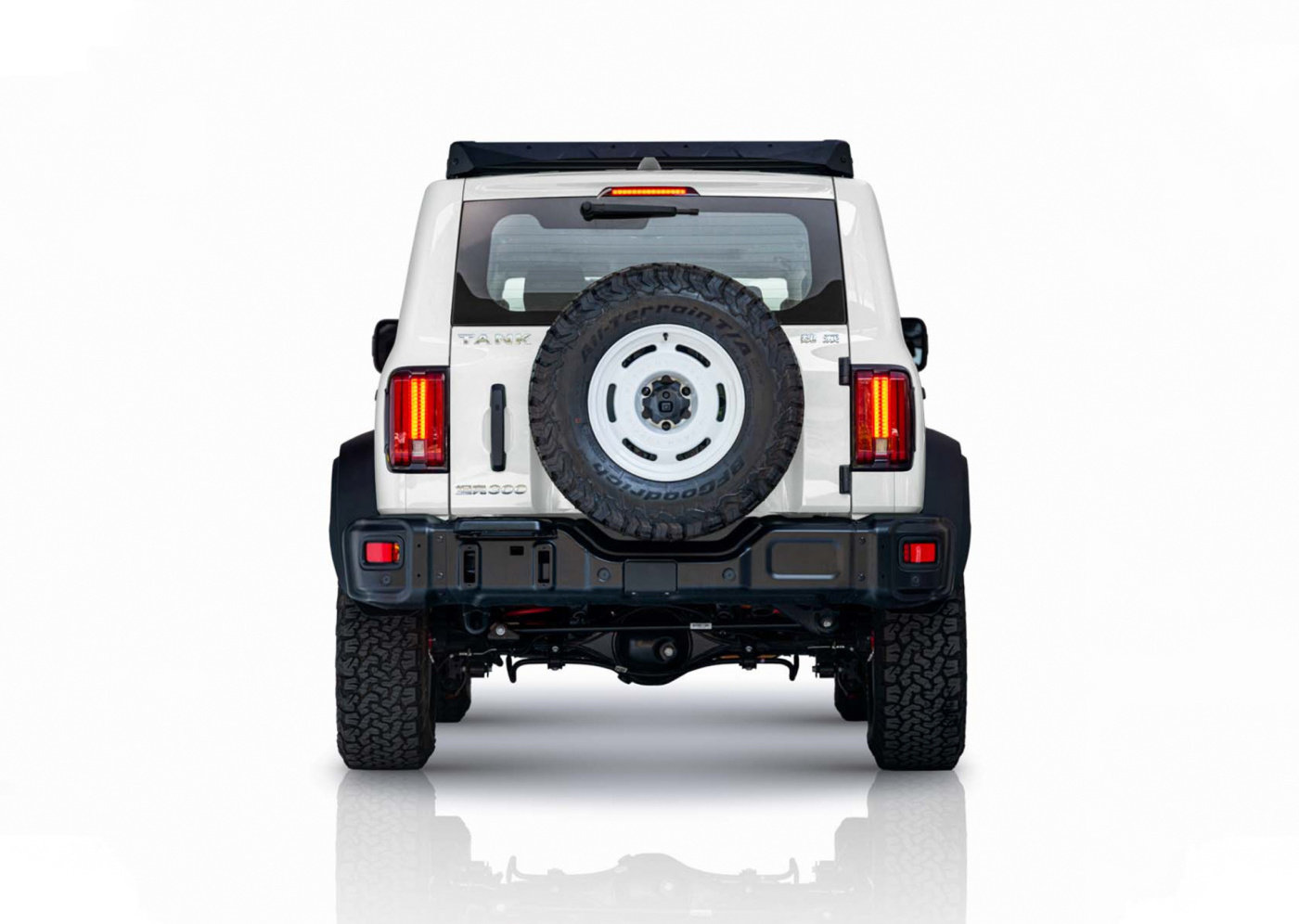 来到尾部,新车的车尾也同样带有硬朗的后包围设计,并配有全尺寸的备胎,以迎合整台车的硬派越野形象。