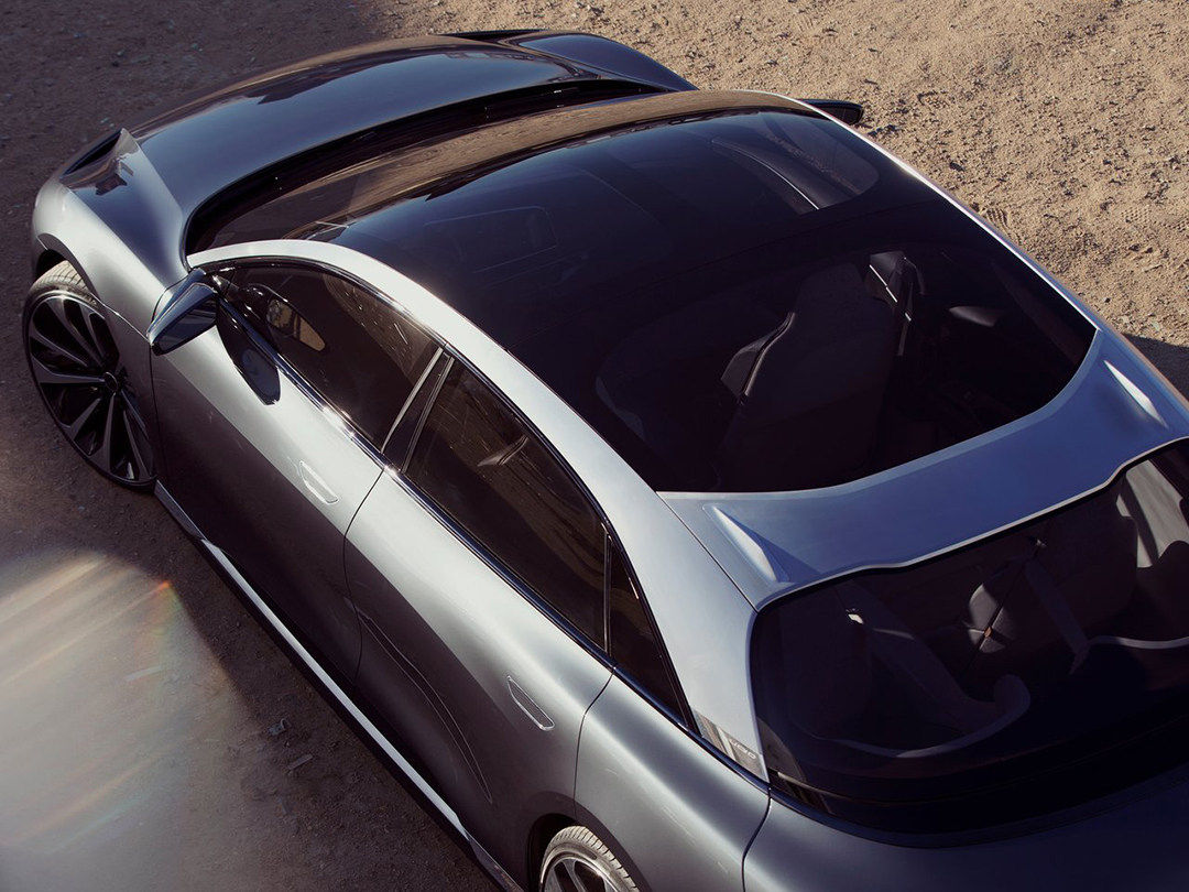 侧面是Lucid Air最具魅力的地方,D柱之后设计了弧背的后风挡玻璃,与保时捷911 Targa车型有异曲同工之妙,车顶也被大面积的玻璃所替代。高配车型装配的是21英寸轮毂,而入门则是19英寸。