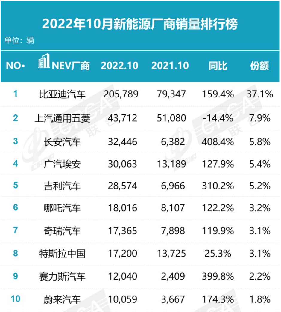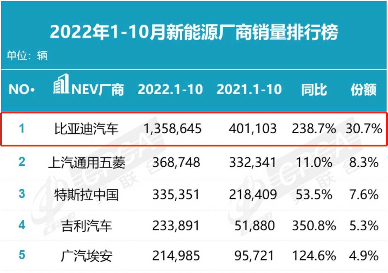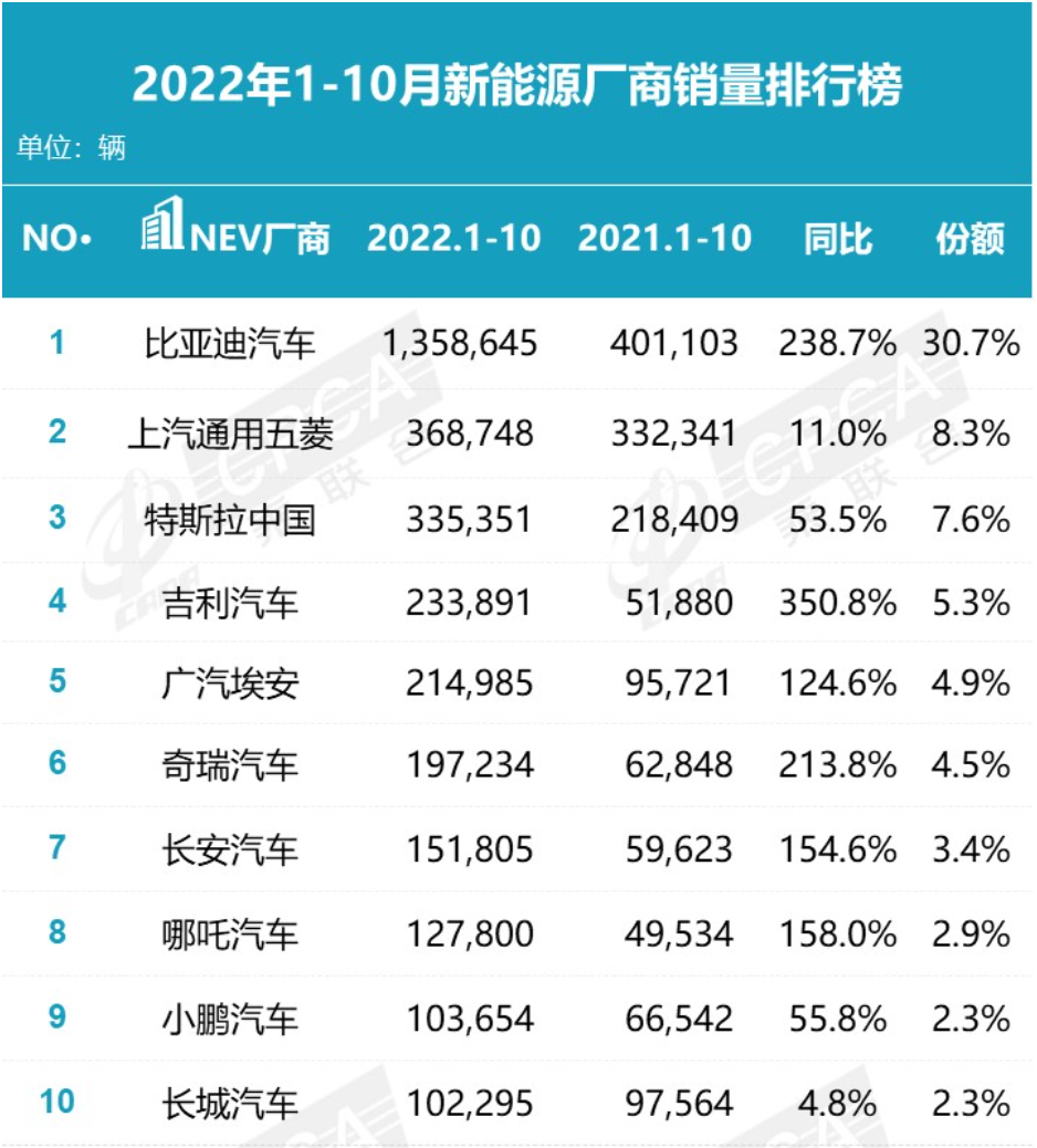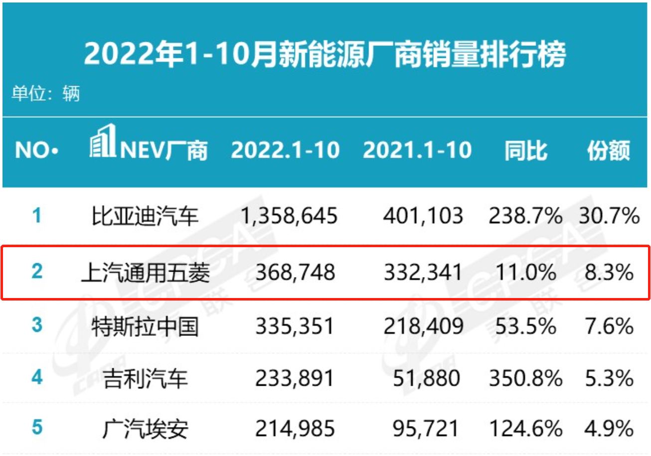 在乘联会公布的新能源汽车销量榜单中,上汽通用五菱成功拿下了《2022年10月新能源厂商销量排行榜》和《2022年1-10月新能源厂商销量排行榜》的双料榜眼。