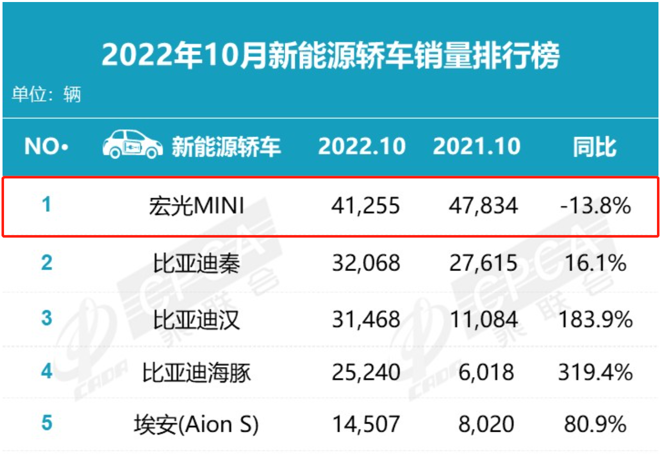 数据显示,上汽通用五菱旗下的宏光MINIEV在今年1-10月份的累计销量达到了338318辆,10月份单月销量达到了41255辆。无论是今年累计销量还是10月份单月销量,中国新能源轿车榜单上当之无愧的销冠。