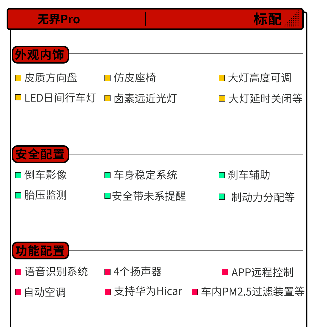 最后来到了无界Pro该选哪个版本的难题,如果您是预算有限且对续航需求不高的话,可选择301km的魔兽版,该车售价为8.99万元,配备制动力分配、刹车辅助等配置。