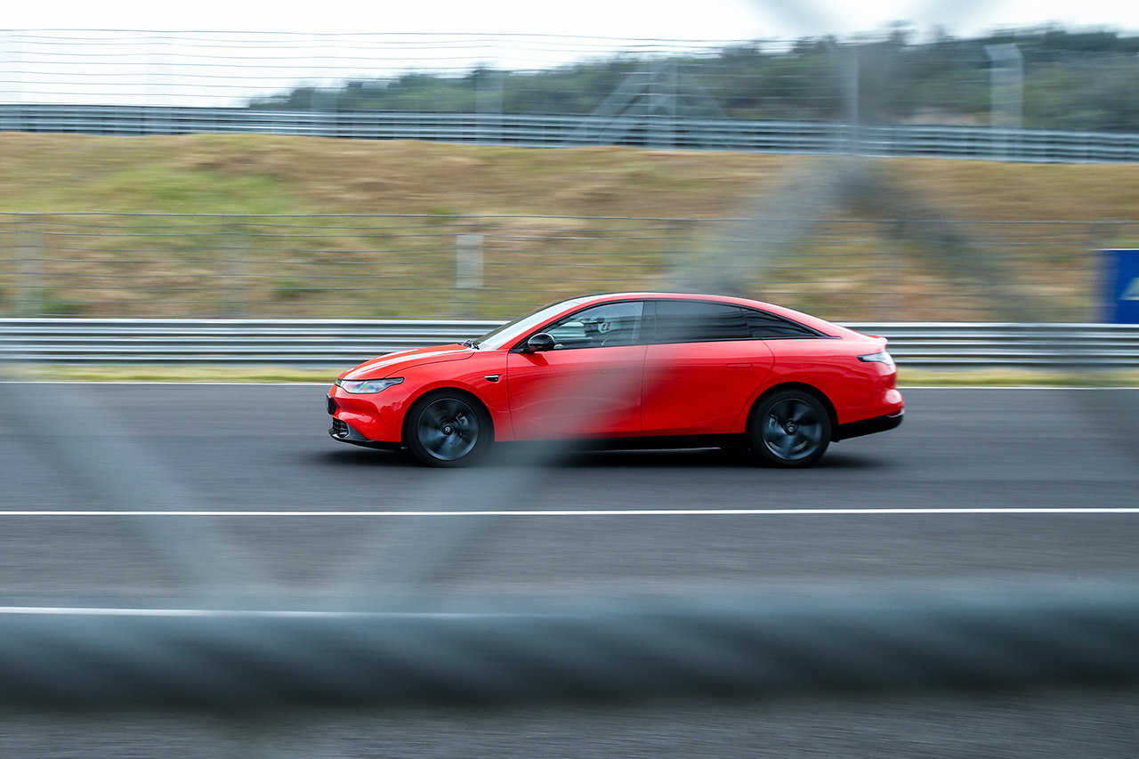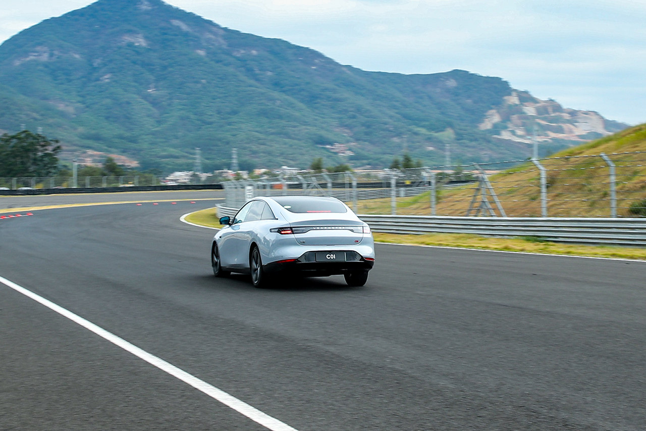 驶出发车区教授尝试感受它的动力输出节奏,逐渐深踩油门,车身姿态微微后仰,电机的扭矩来的非常直接,而且在电控系统的帮助下,四条车轮没有任何打滑,整个加速过程十分线性且安静,驾驶者会被加速度按在座椅上,刚开始还有种“上头”的感觉。