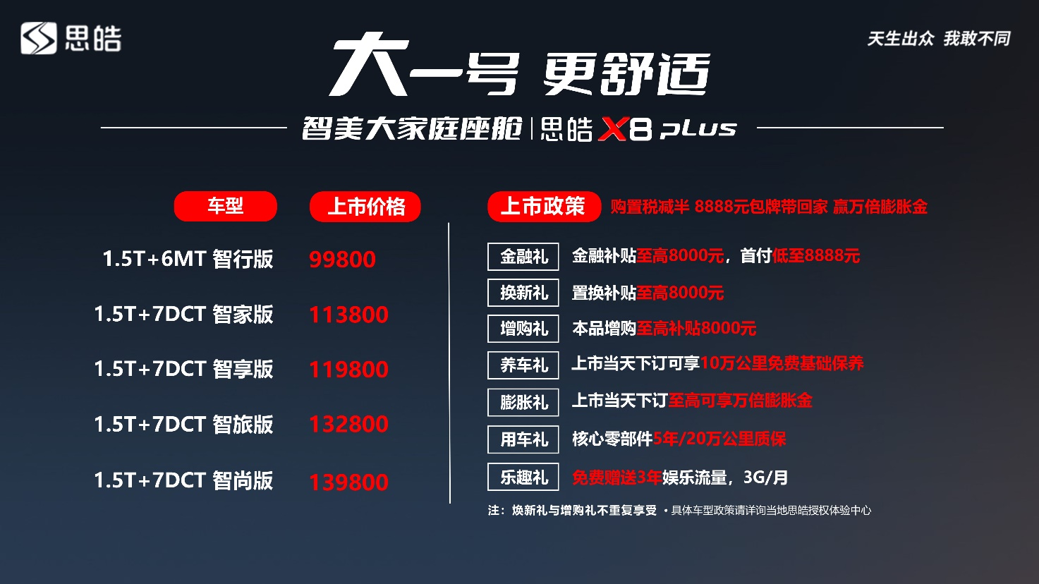 思皓X8 PLUS共5款车型,官方指导价9.98万元-13.98万元,并尊享多重大礼:订车可享受至高8000元金融补贴、至高8000元增换购补贴、核心零部件5年或20万公里质保、3年免费娱乐流量(3G/月)、上市当天下订可享10万公里免费基础保养和至高万倍膨胀金等,诚意十足,让广大用户悦享高品质舒适出行。