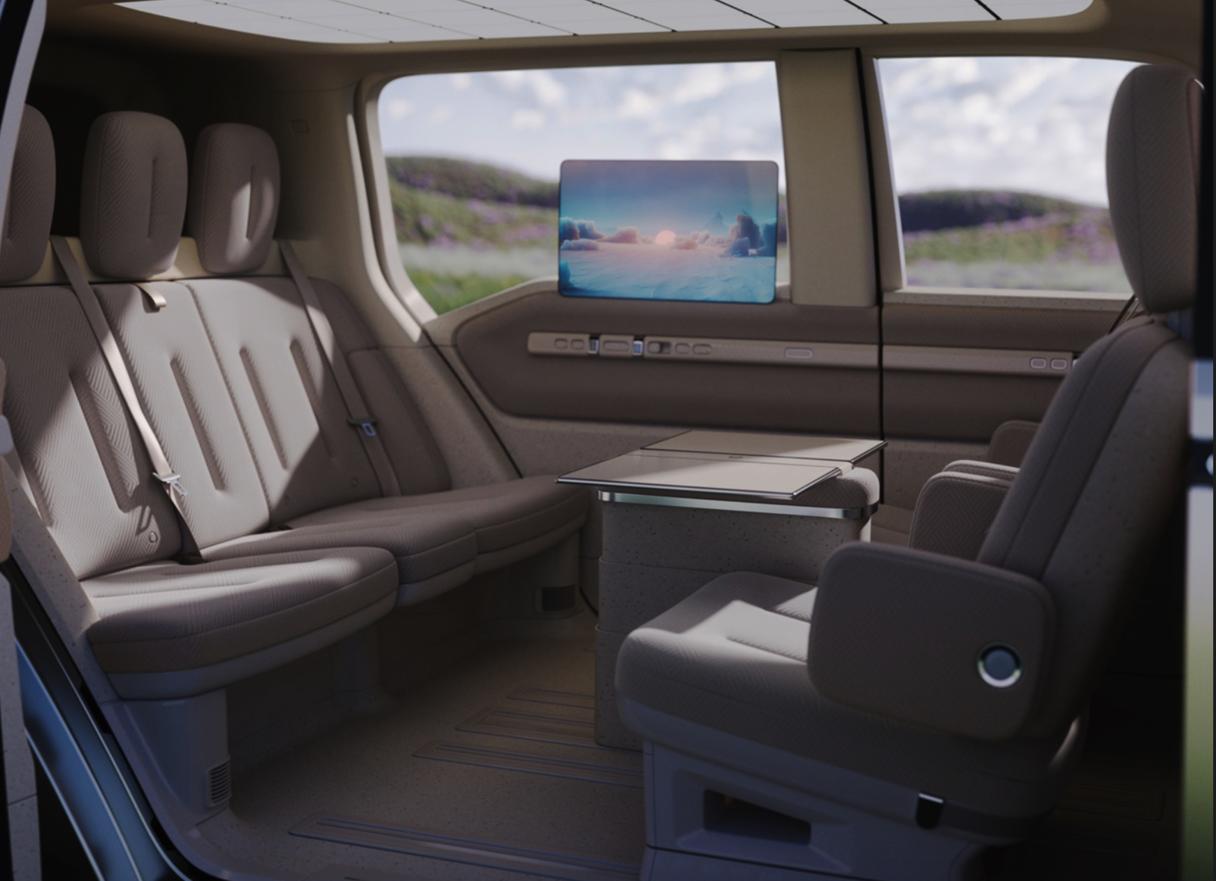 至于图中车内的小桌板及可拆卸的娱乐大屏,也能充分诠释出新车作为移动第三空间的使用特点。