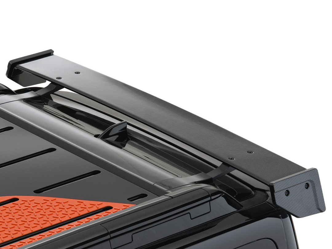 内置滑轨的车顶行李架也没有了赛博坦克上的探照灯元素,但会与内饰颜色进行双色搭配。前后双碳纤维翼这次直接把纹理裸露了出来。