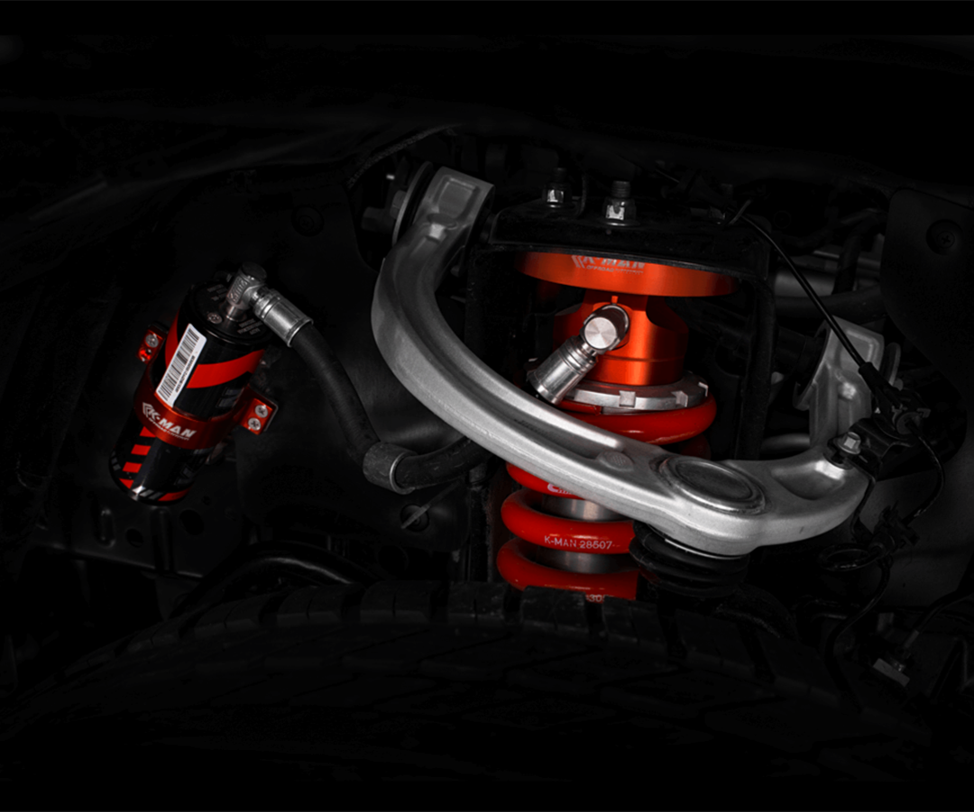 底盘升级了加高弹簧和K-MAN专业级全地形氮气减震器,还配合了加强半轴,加宽后桥,加长连杆,加长下支臂等来应对车辆升高后的动态平衡。