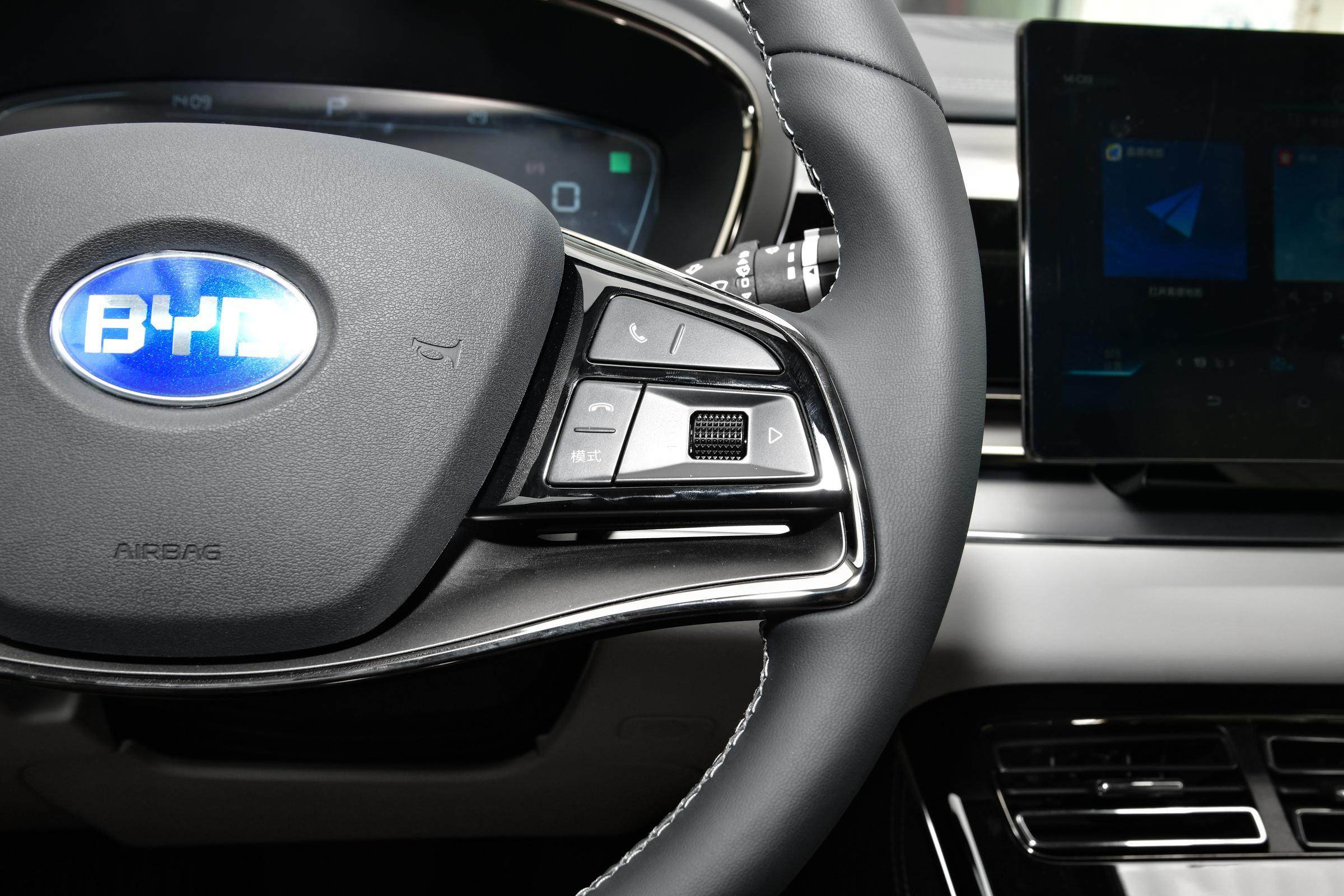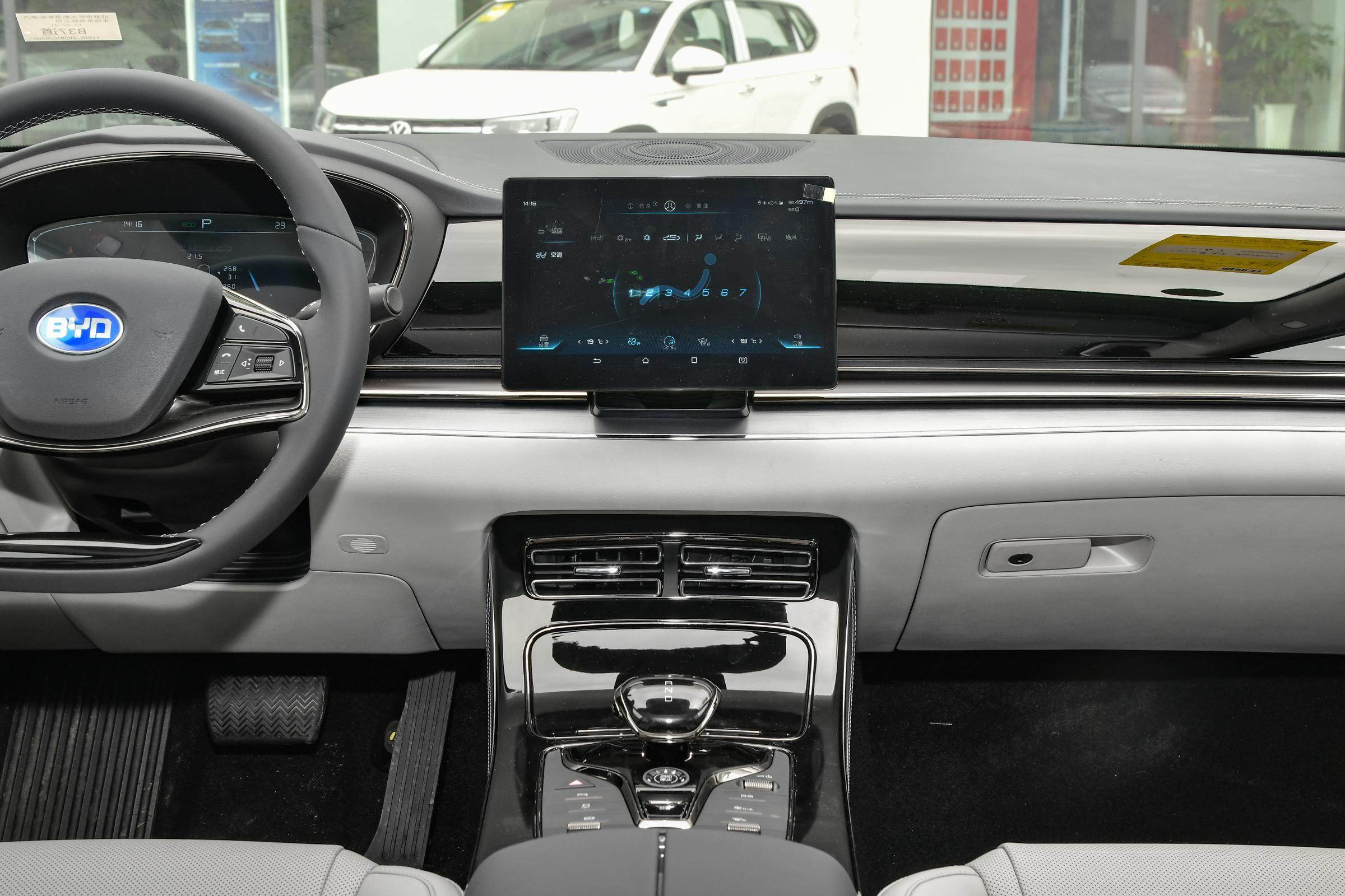 在内饰方面,新车同样与旧款车型没有太大的差异,整体的设计布局也是沿用了汉EV的风格。对称式的布局加上12.3英寸大尺寸全液晶仪表以及可旋转的中控液晶屏,设计十分简洁且富有科技感,其中控布局、扶手设计以及内饰用料也基本与汉EV相同,整体质感算是同级中主流水准。