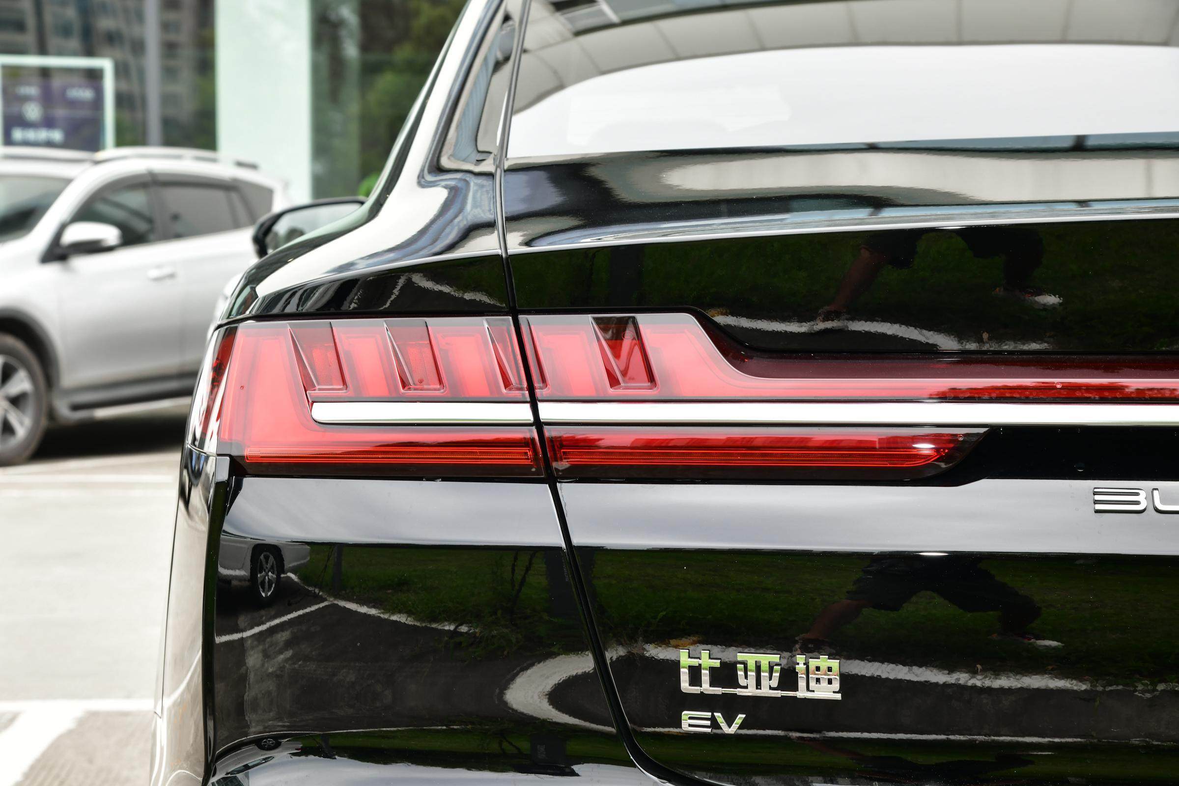 其车尾造型则与旧款的比亚迪汉EV非常相似,龙爪造型的贯穿式尾灯十分具有辨识度和标志性,加上亮色的镀铬饰条以及简约的LOGO标识,整体看上去较为简洁,也较为符合现代车型的设计。