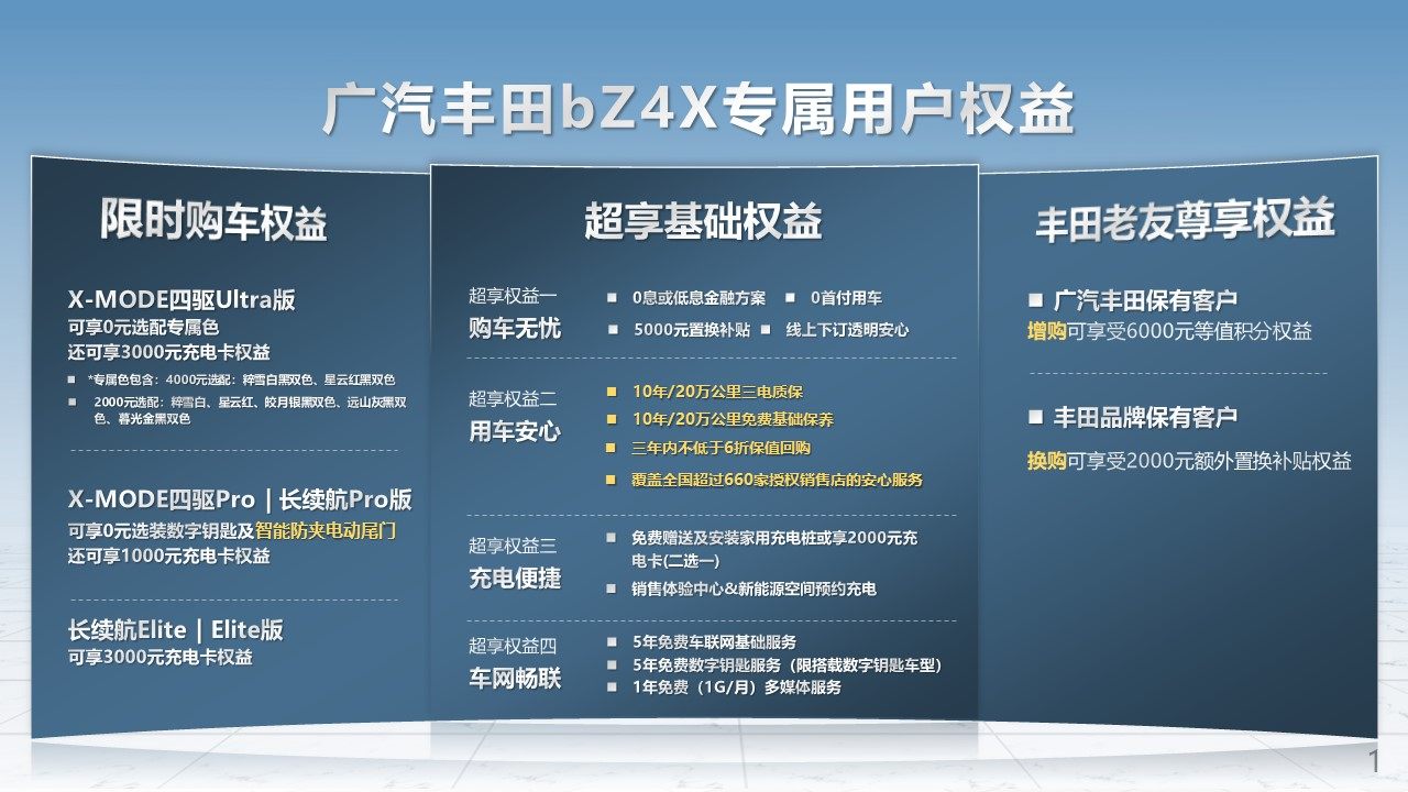 即日起选择广汽丰田bZ4X,可以获得10年或20万公里三电质保、10年或20万公里免费检查/保养、三年内不低于6折保值回购、免费赠送及安装家用充电桩或享2000元充电卡(二选一)、以及5年免费车联网服务等。