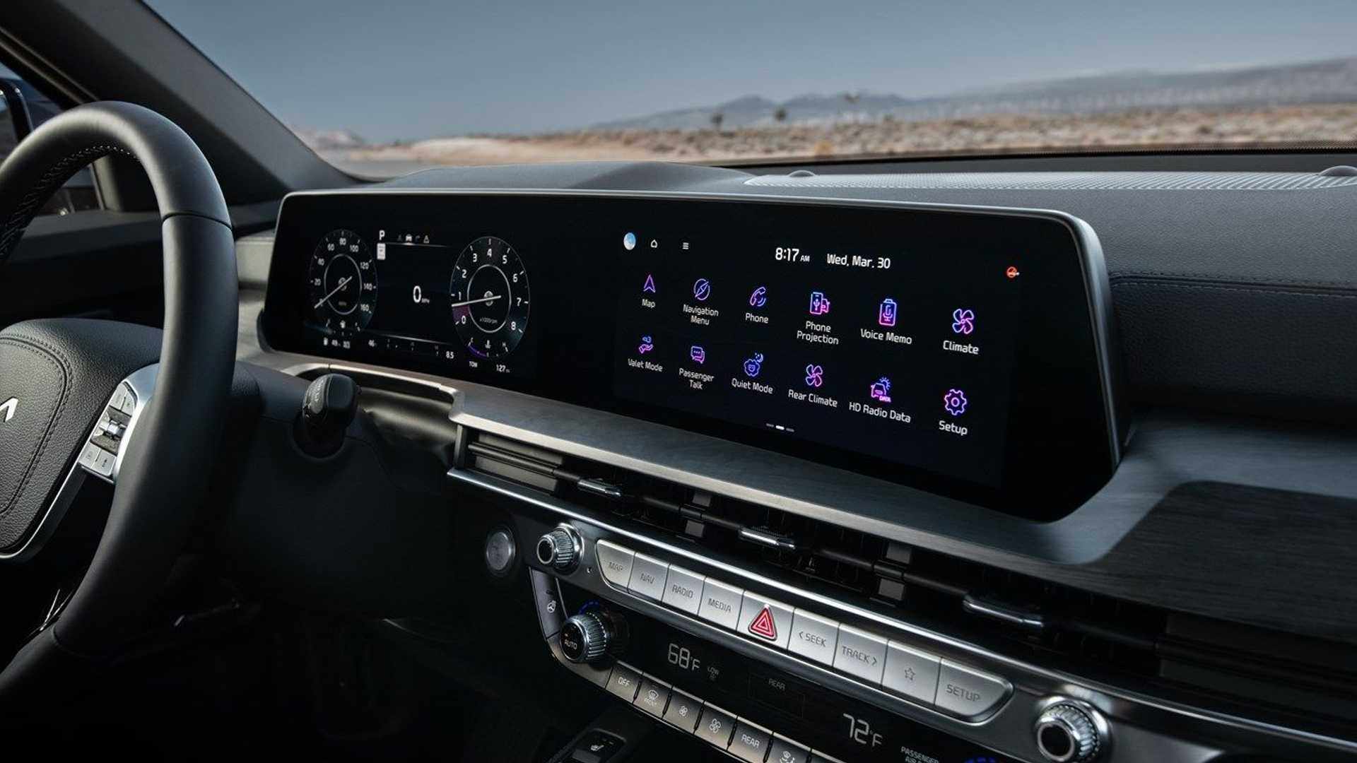 而12.3英寸全液晶仪表+12.3英寸悬浮式中控大屏的加入,科技感随即变得更为强烈。中控屏内置Kia Connect的功能,除了支持手机进行远程解锁之余,娱乐系统、导航地图还可通过无线的方式进行更新,这对于用户而言无疑是一大福音。